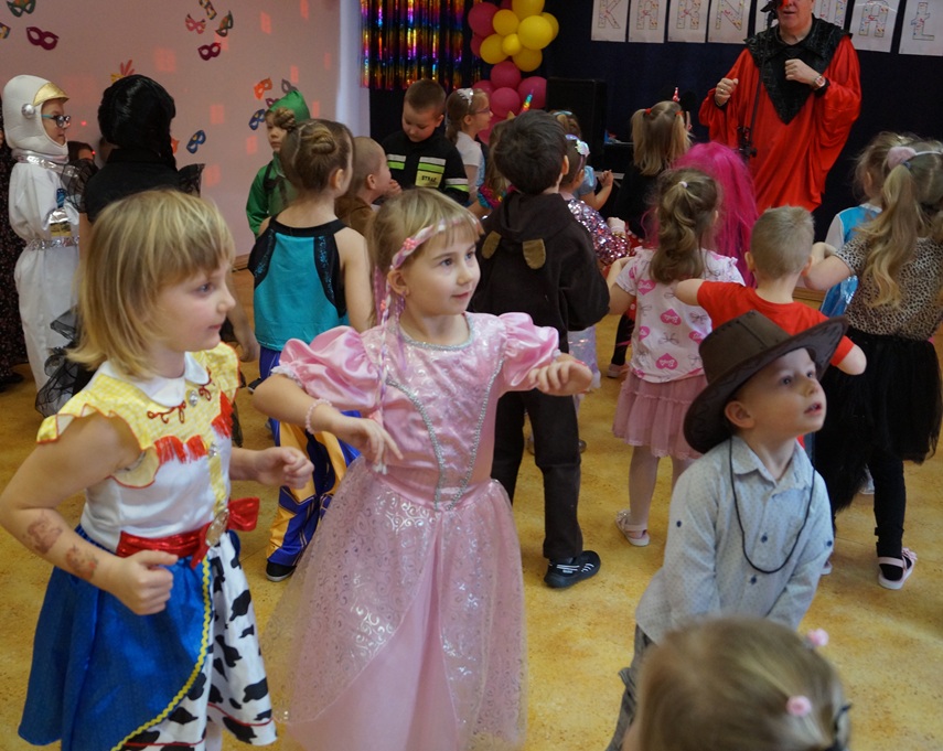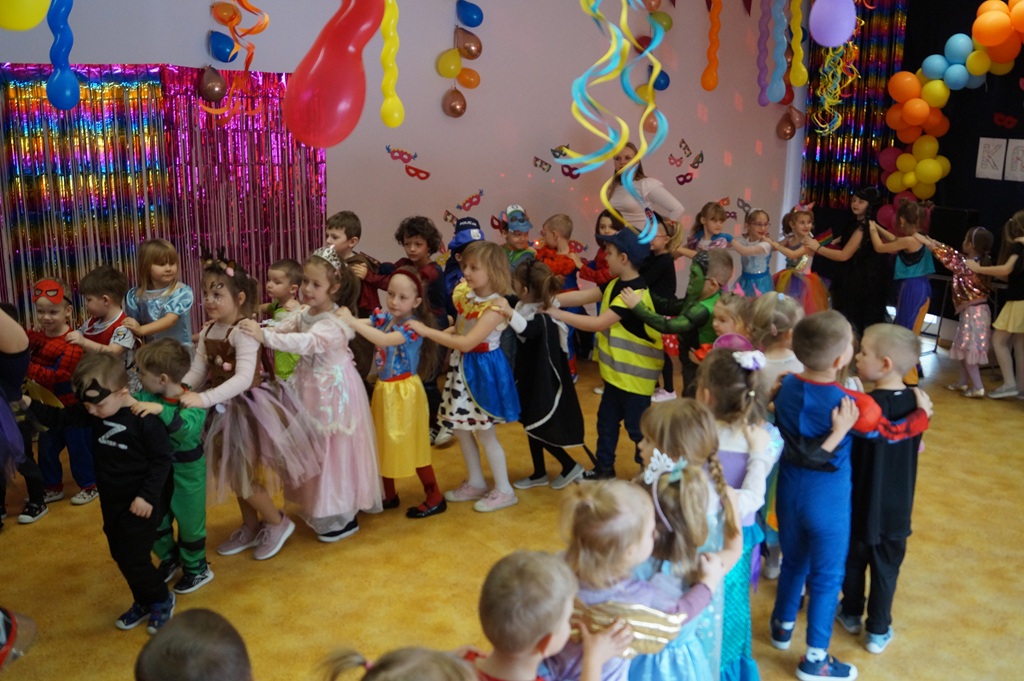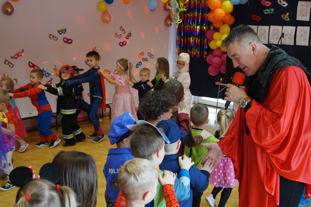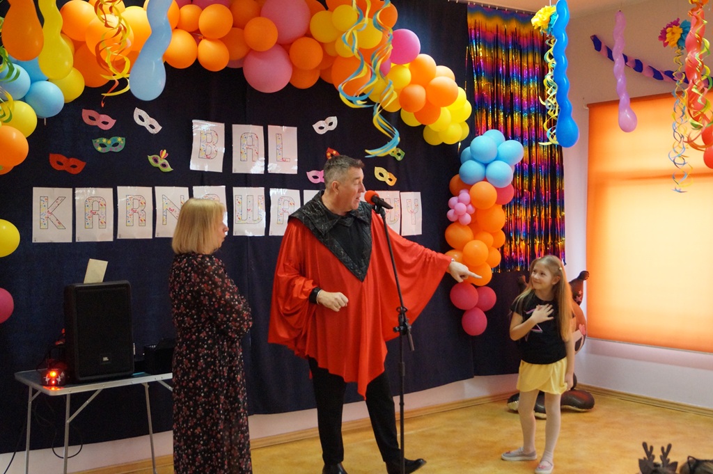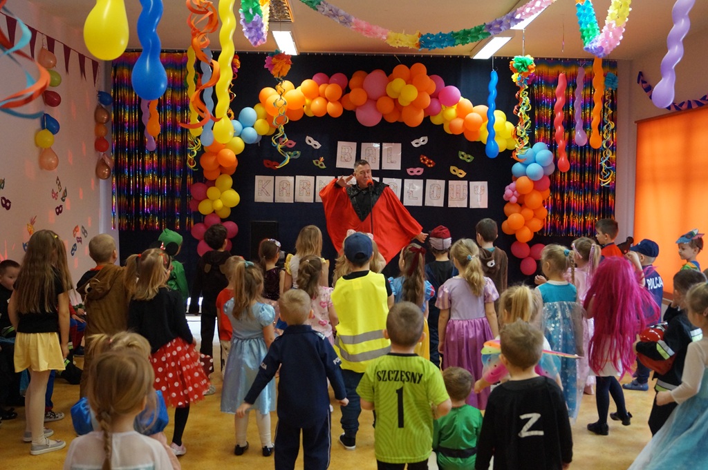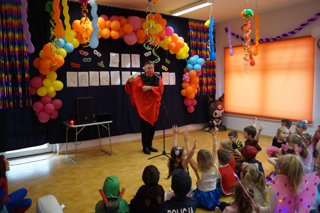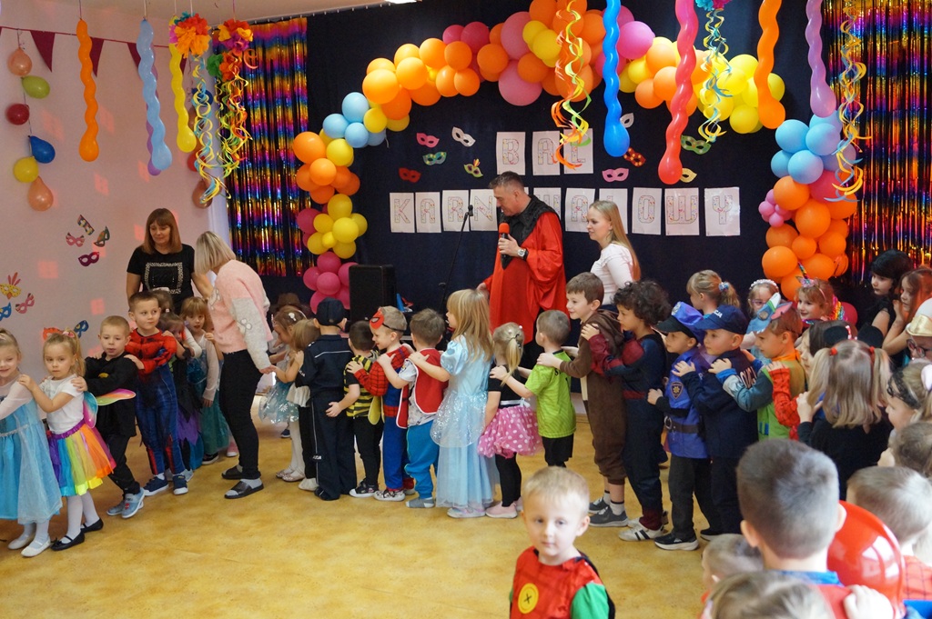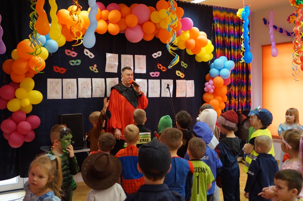 Podczas balu zorganizowano tańce oraz konkursy, które dostarczyły dzieciom wielu pozytywnych wrażeń. Uczestnikom towarzyszyła radosna atmosfera, a wspólna zabawa sprzyjała integracji grup przedszkolnych. Bal poprowadził Pan Maciej Duda - iluzjonista Damatus Studio Magic ART. Dla dzieci przygotowano również słodki poczęstunek.