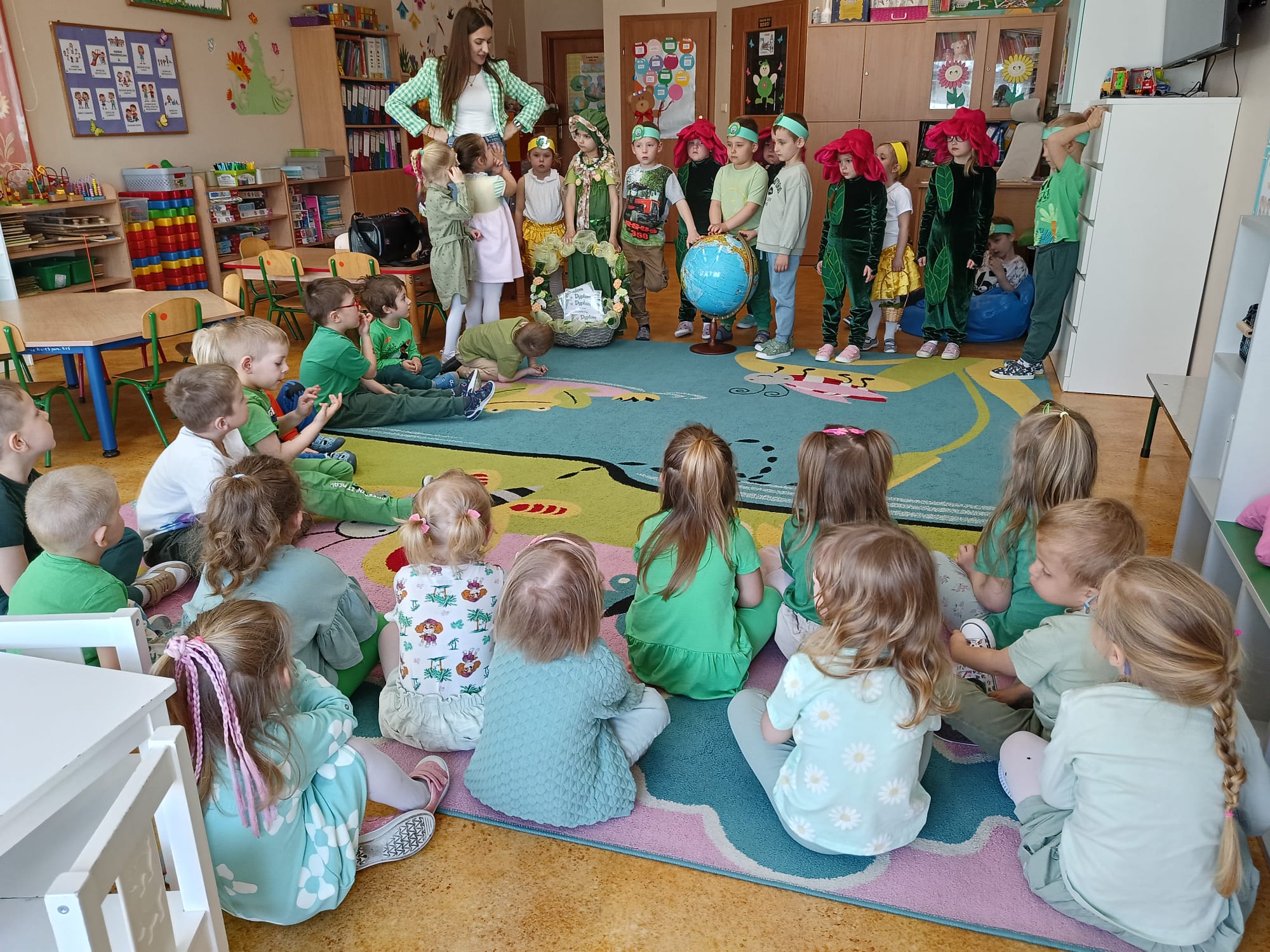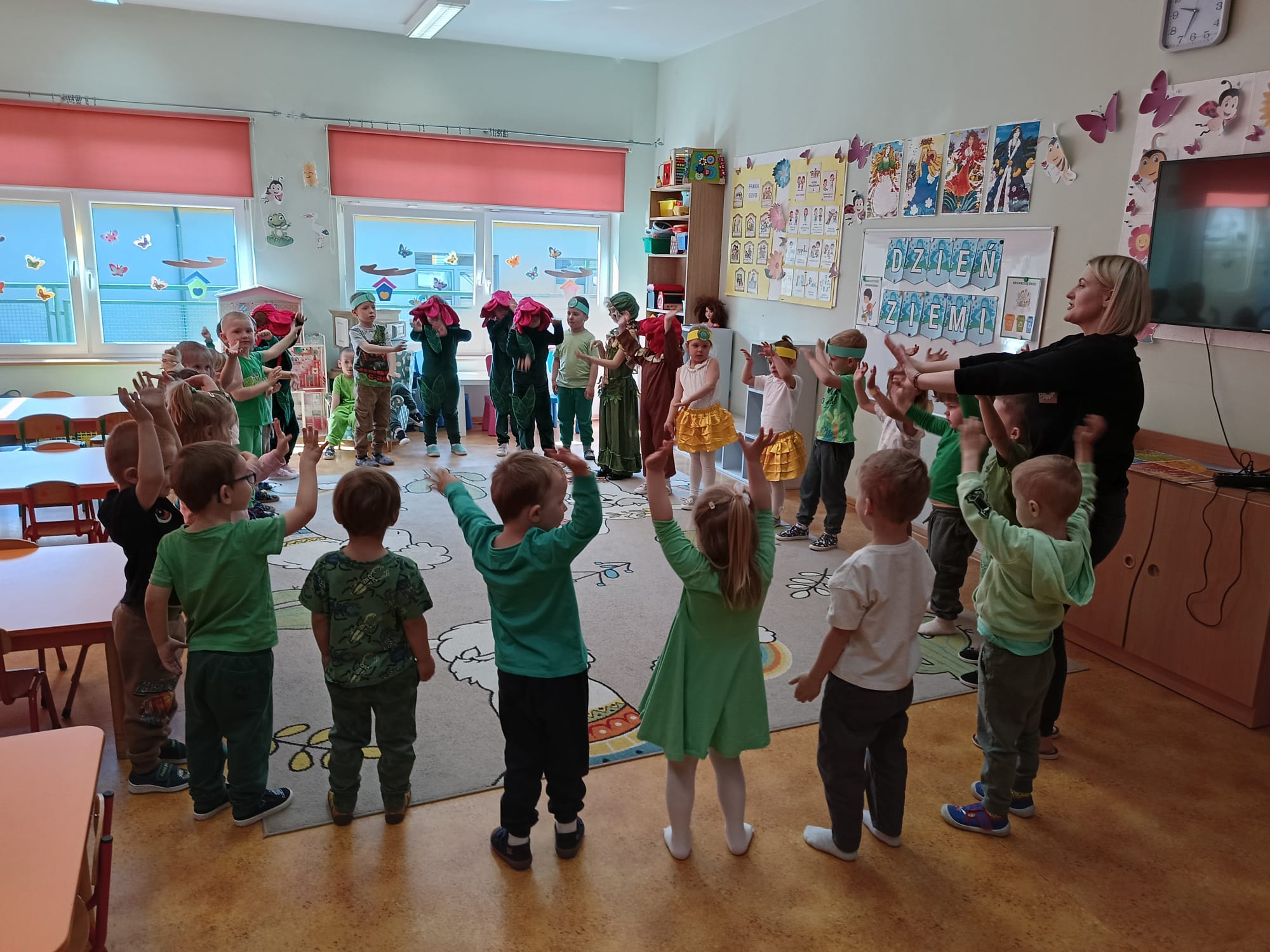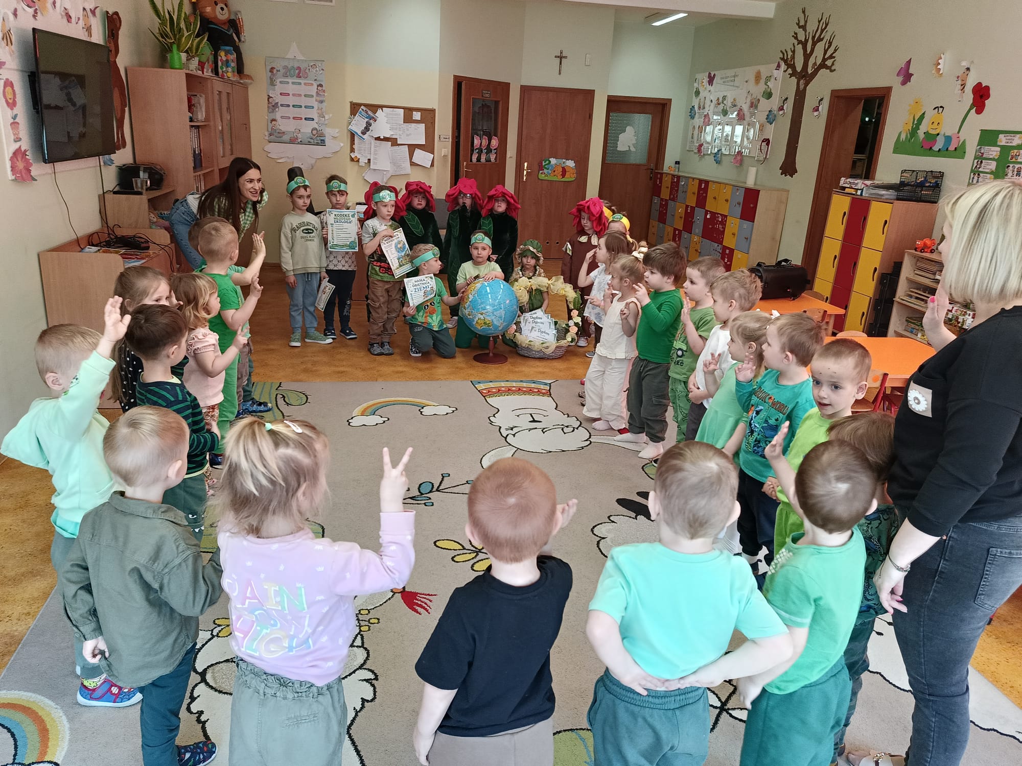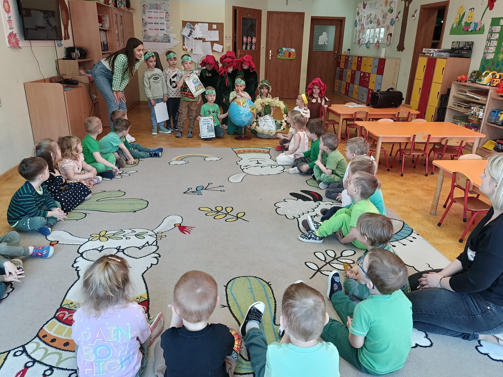 i pełnej zaangażowania atmosferze. Dzieci z grupy Muchomorki odwiedzały pozostałe sale, zapraszając wszystkich do wspólnej zabawy z okazji tego wyjątkowego święta. Każda z grup wzięła udział w zajęciach poświęconych ochronie środowiska, podczas których dzieci dowiedziały się, jak dbać o naszą planetę na co dzień.