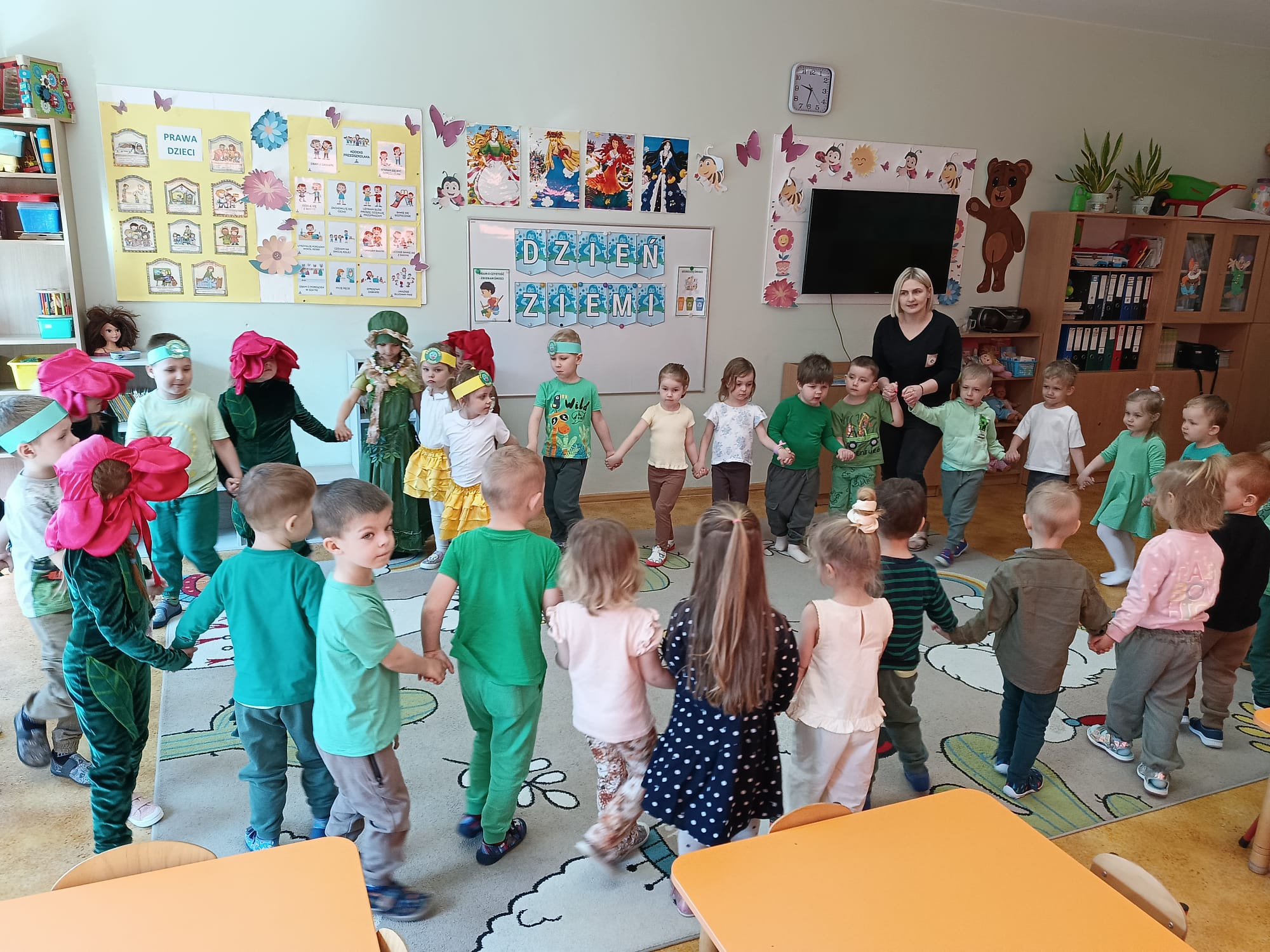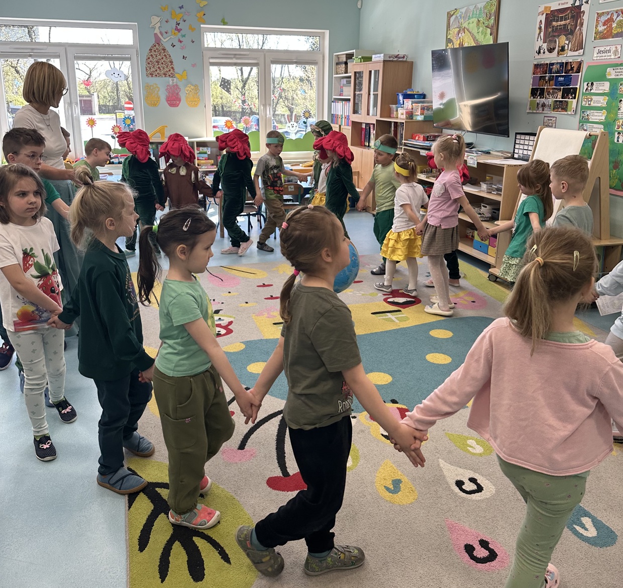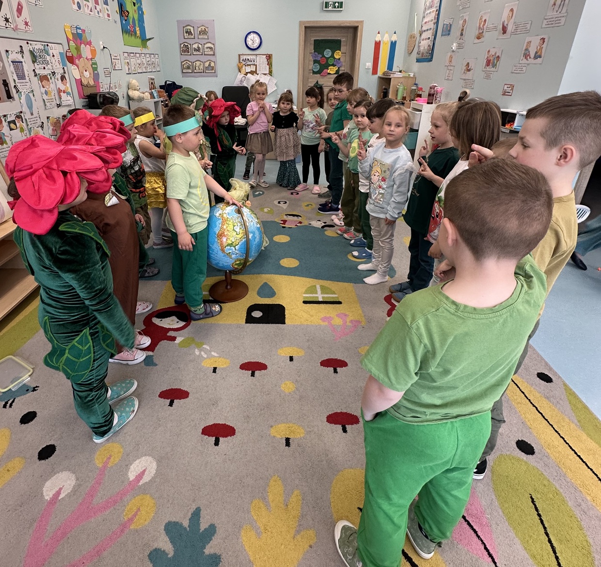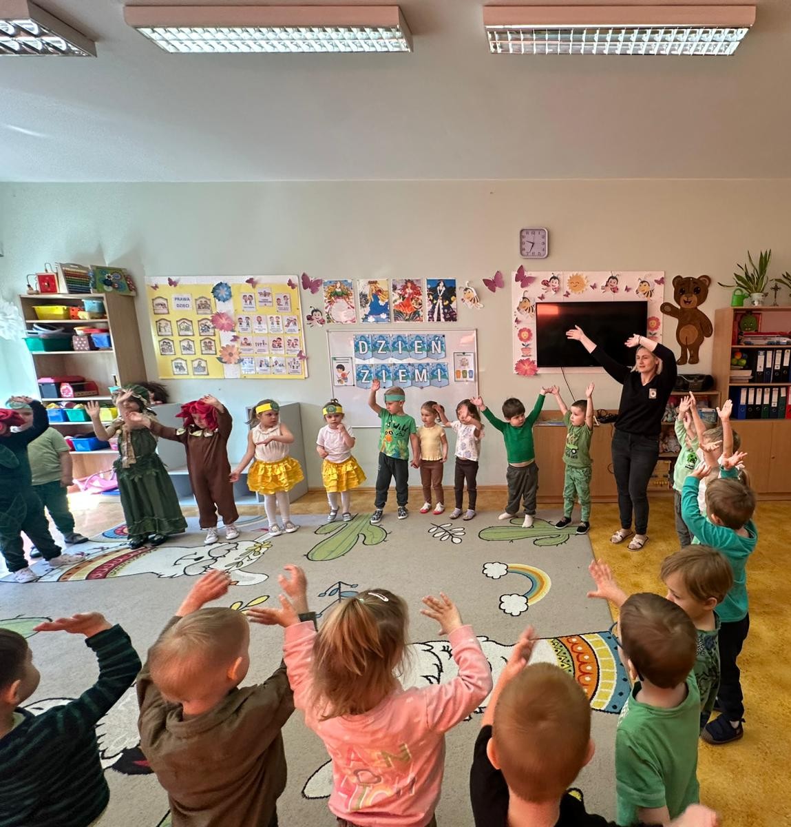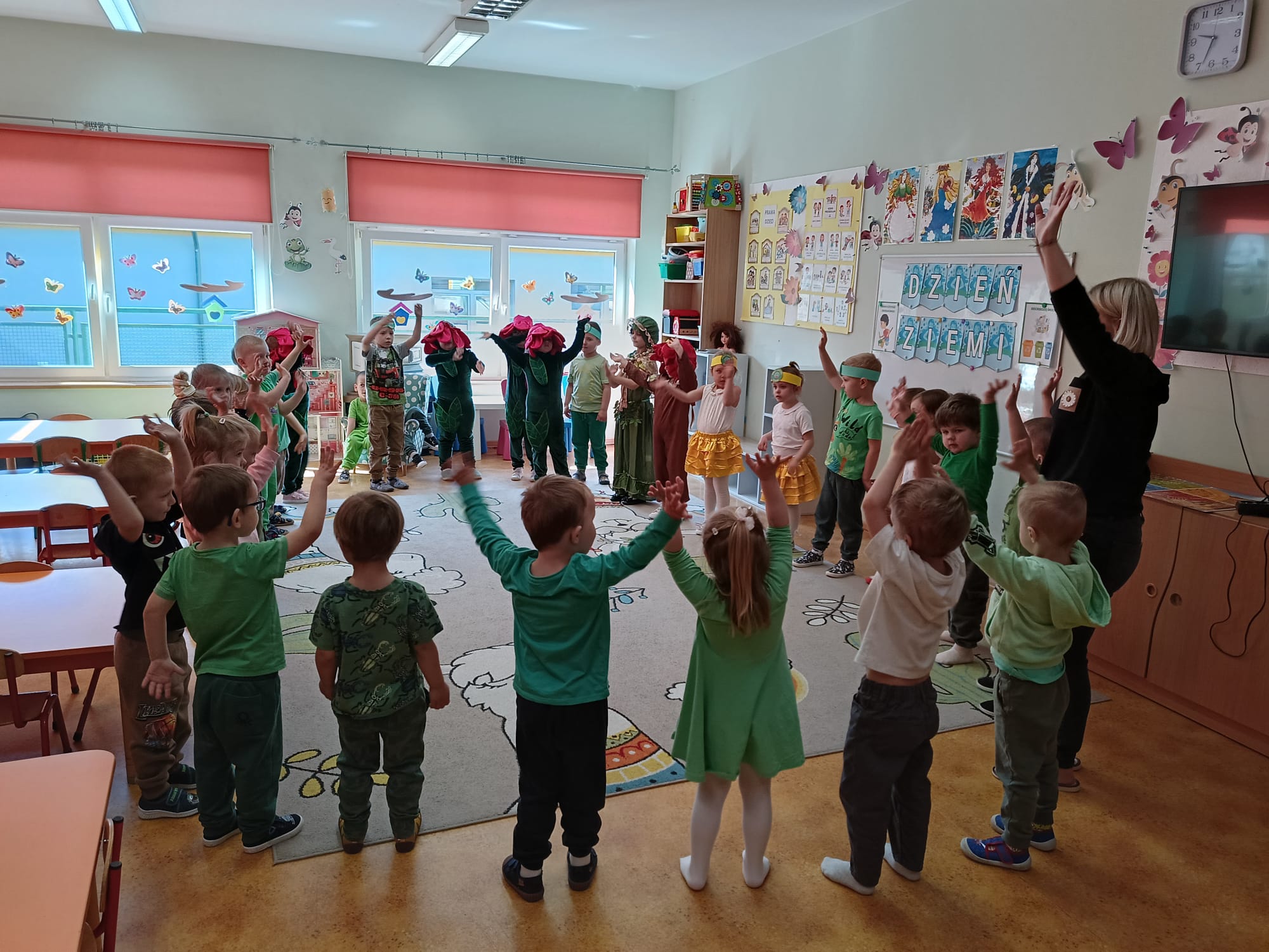 i pełnej zaangażowania atmosferze. Dzieci z grupy Muchomorki odwiedzały pozostałe sale, zapraszając wszystkich do wspólnej zabawy z okazji tego wyjątkowego święta. Każda z grup wzięła udział w zajęciach poświęconych ochronie środowiska, podczas których dzieci dowiedziały się, jak dbać o naszą planetę na co dzień.