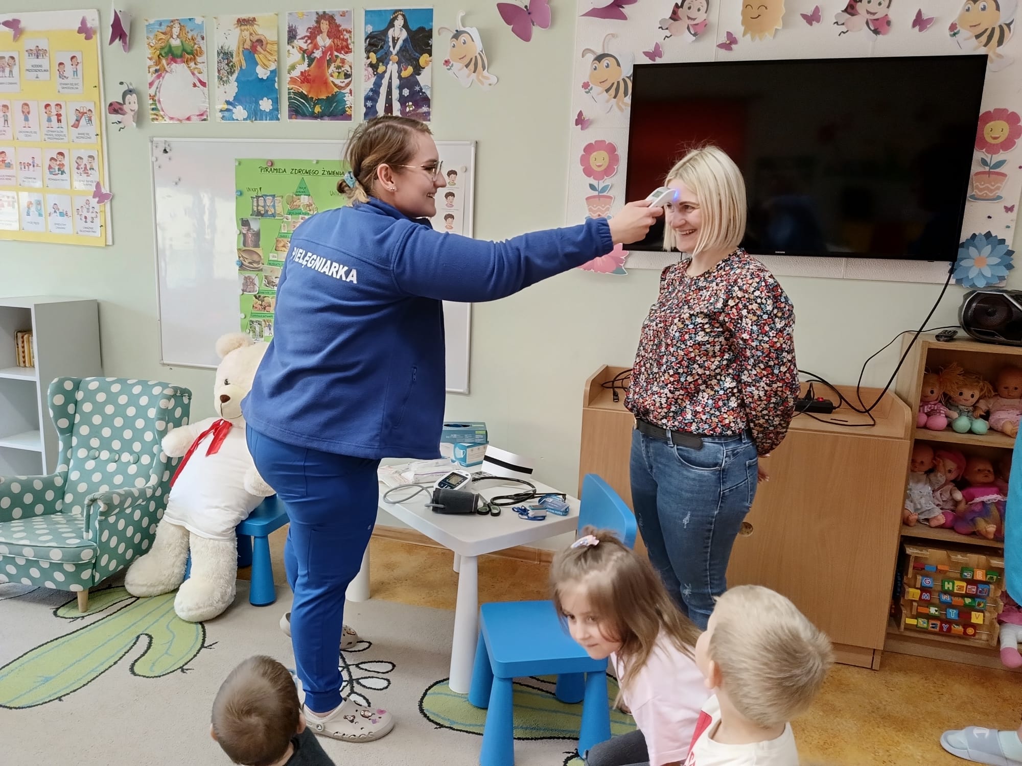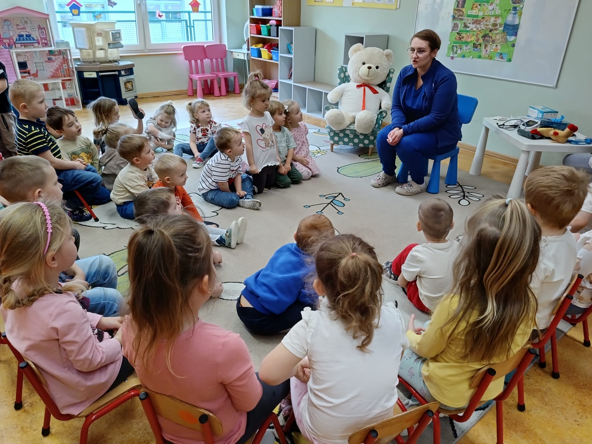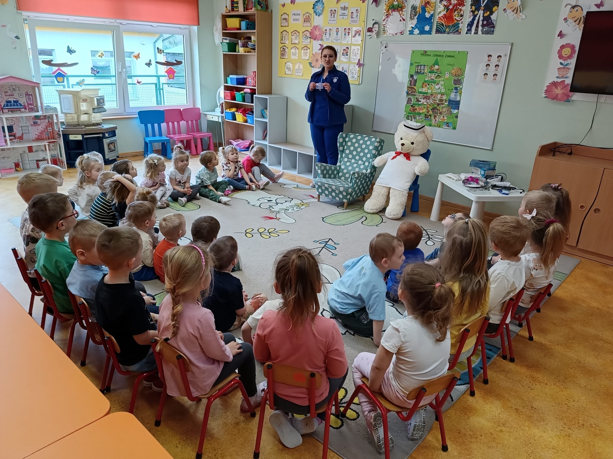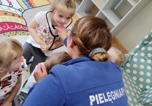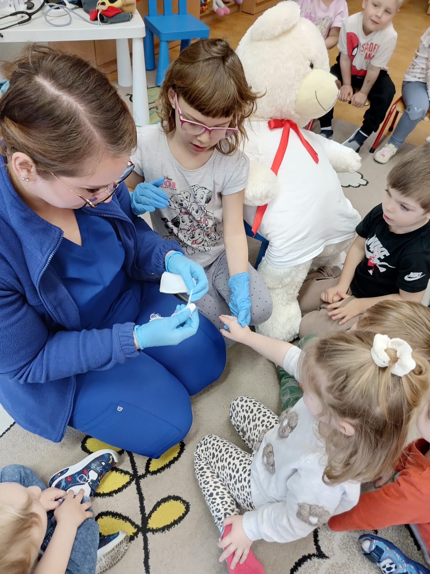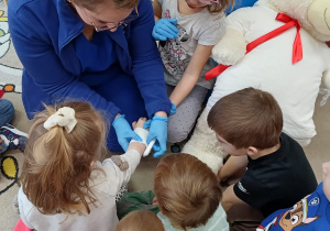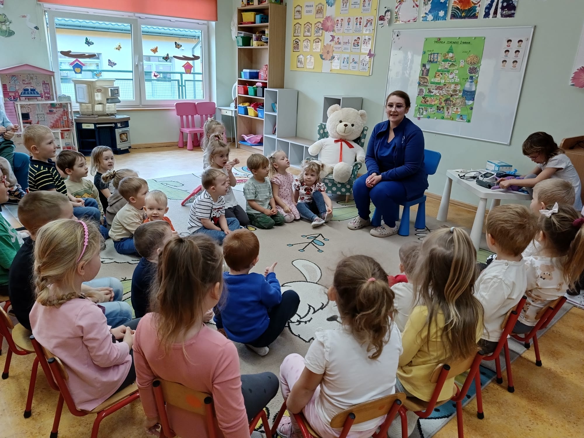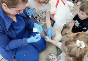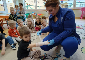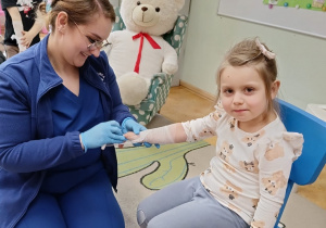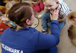 W piątek 27 marca przybył do grupy Krasnali i Motylków, niecodzienny gość – pielęgniarka Pani Karolina Dubiel. Pani Karolina opowiedziała dzieciom na czym polega jej praca, zaprezentowała atrybuty jakimi posługuje się w codziennej pracy, przekazała też informacje jak dbać o zdrowie i higienę. Przedszkolaki uczyły się jak opatrzyć ranę, założyć opaskę uciskową, przykleić plaster, zmierzyć ciśnienie, zrobić zastrzyk, przy pomocy stetoskopu wysłuchiwały bicia serca. Tak praktyczną i zarazem atrakcyjną lekcję z pewnością dzieci zapamiętają na długo. Serdecznie dziękujemy pani Karolinie za poświęcony nam czas. Wizyta pani pielęgniarki zakończyła się pamiątkowym zdjęciem, a Pani Katarzyna Święcicka