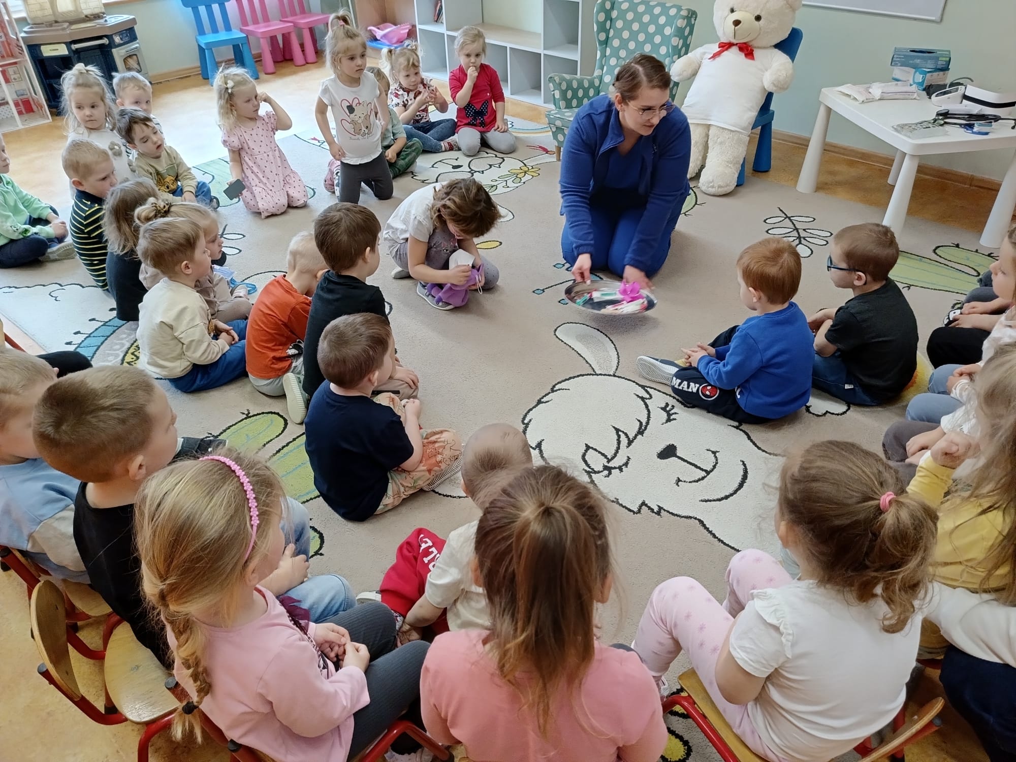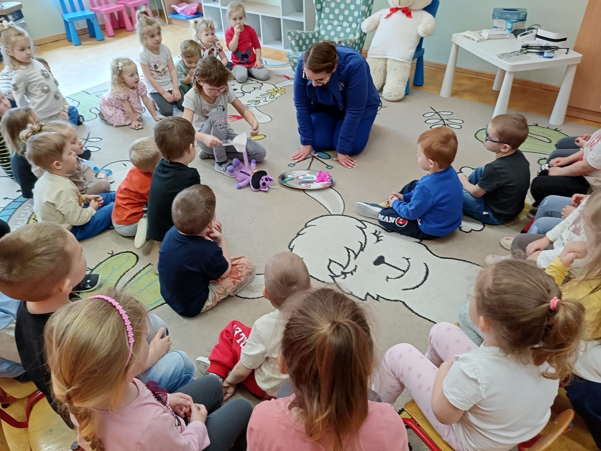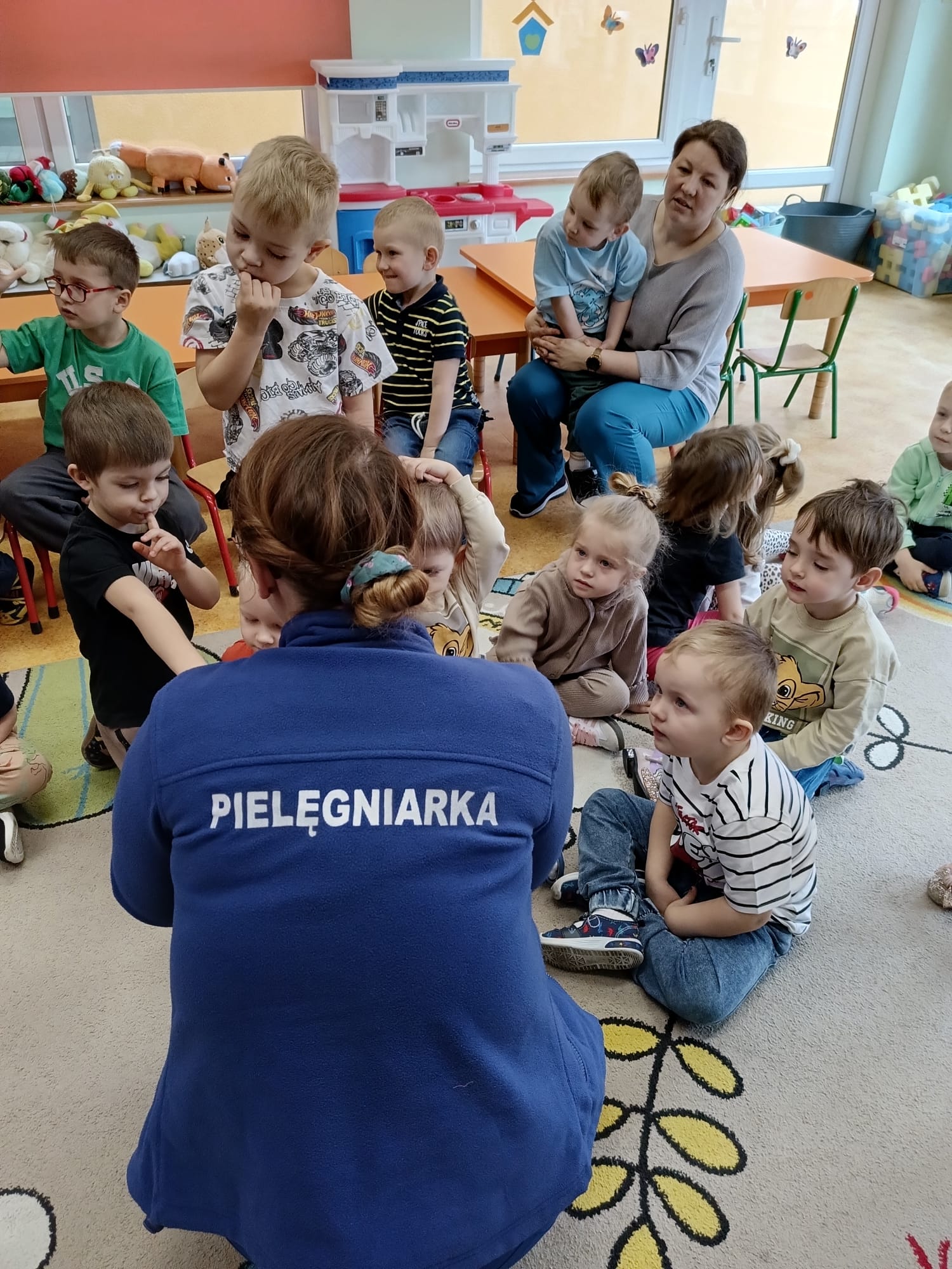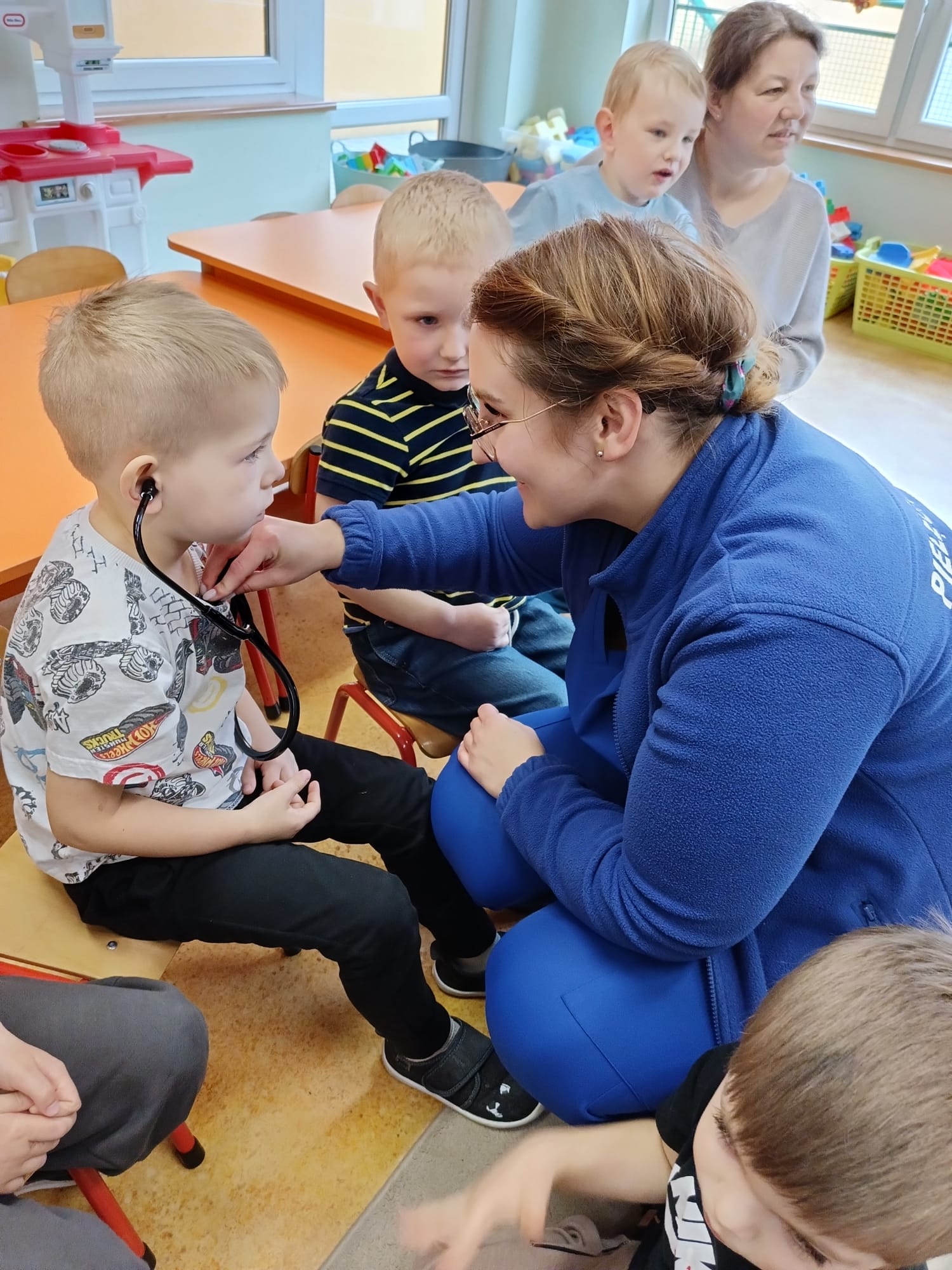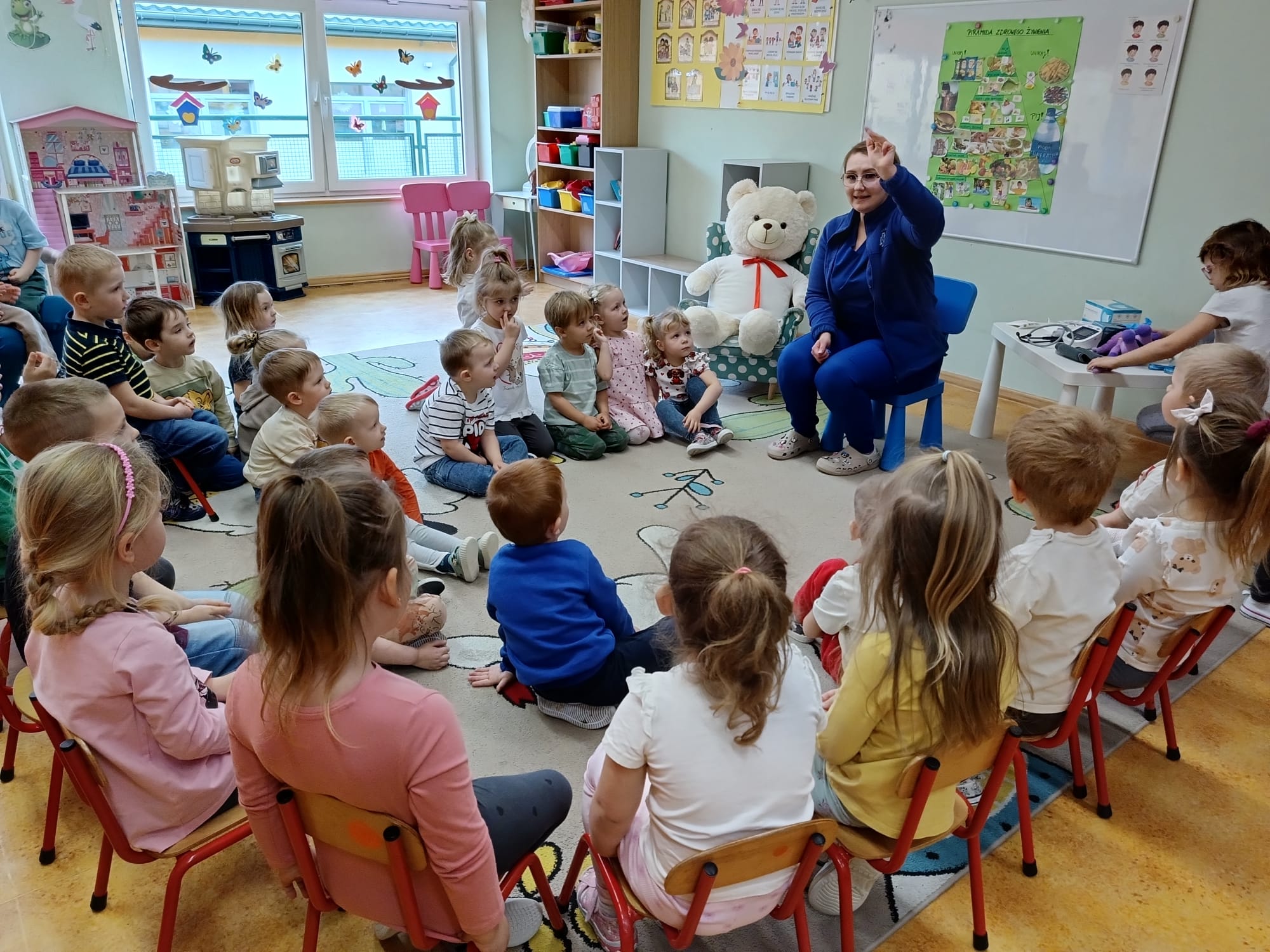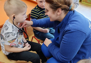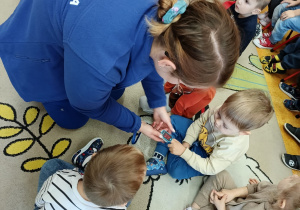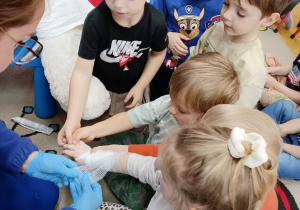 W piątek 27 marca przybył do grupy Krasnali i Motylków, niecodzienny gość – pielęgniarka Pani Karolina Dubiel. Pani Karolina opowiedziała dzieciom na czym polega jej praca, zaprezentowała atrybuty jakimi posługuje się w codziennej pracy, przekazała też informacje jak dbać o zdrowie i higienę. Przedszkolaki uczyły się jak opatrzyć ranę, założyć opaskę uciskową, przykleić plaster, zmierzyć ciśnienie, zrobić zastrzyk, przy pomocy stetoskopu wysłuchiwały bicia serca. Tak praktyczną i zarazem atrakcyjną lekcję z pewnością dzieci zapamiętają na długo. Serdecznie dziękujemy pani Karolinie za poświęcony nam czas. Wizyta pani pielęgniarki zakończyła się pamiątkowym zdjęciem, a Pani Katarzyna Święcicka