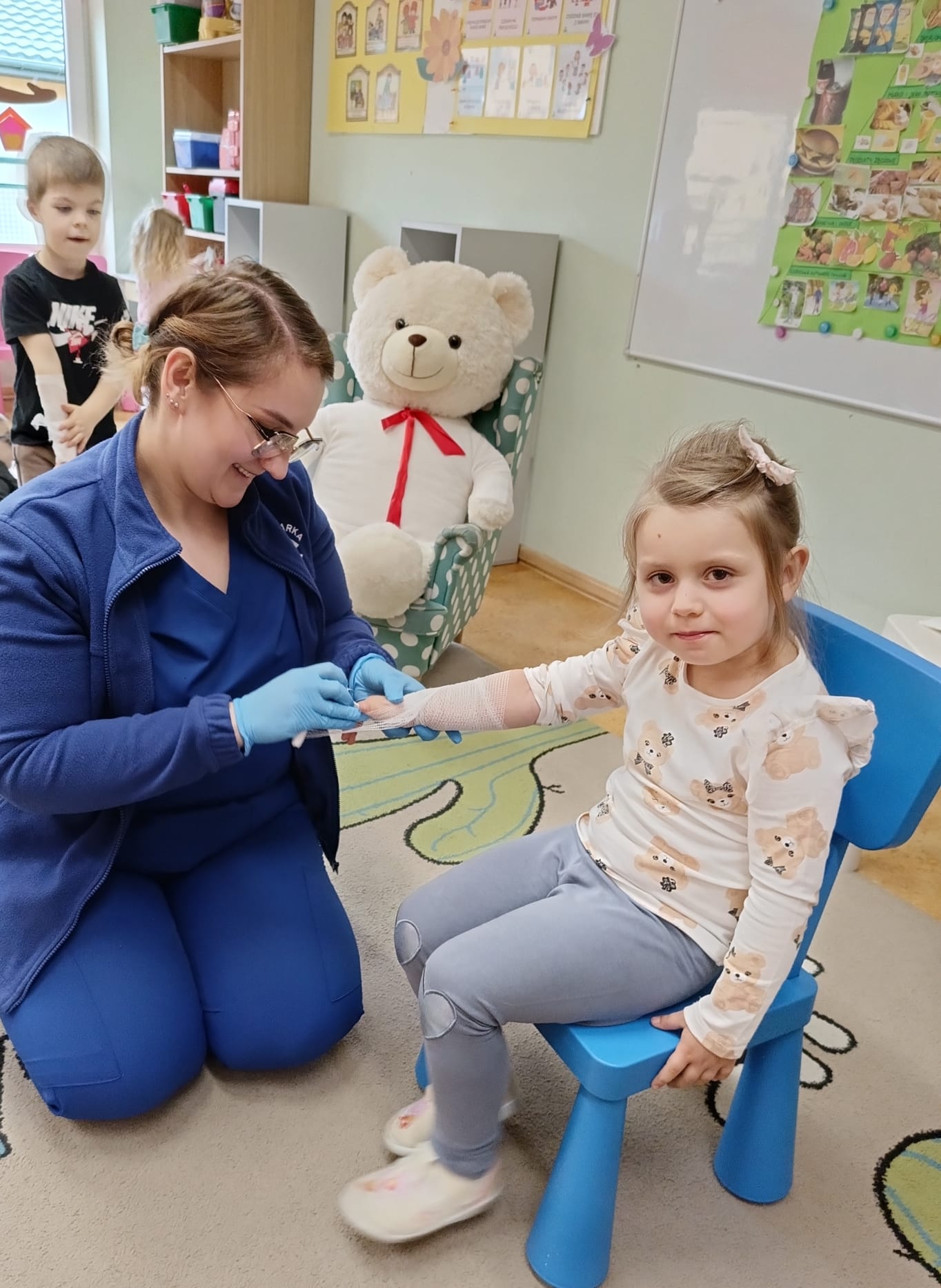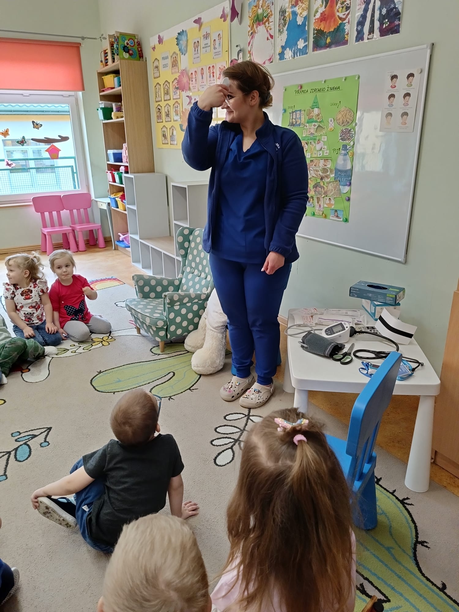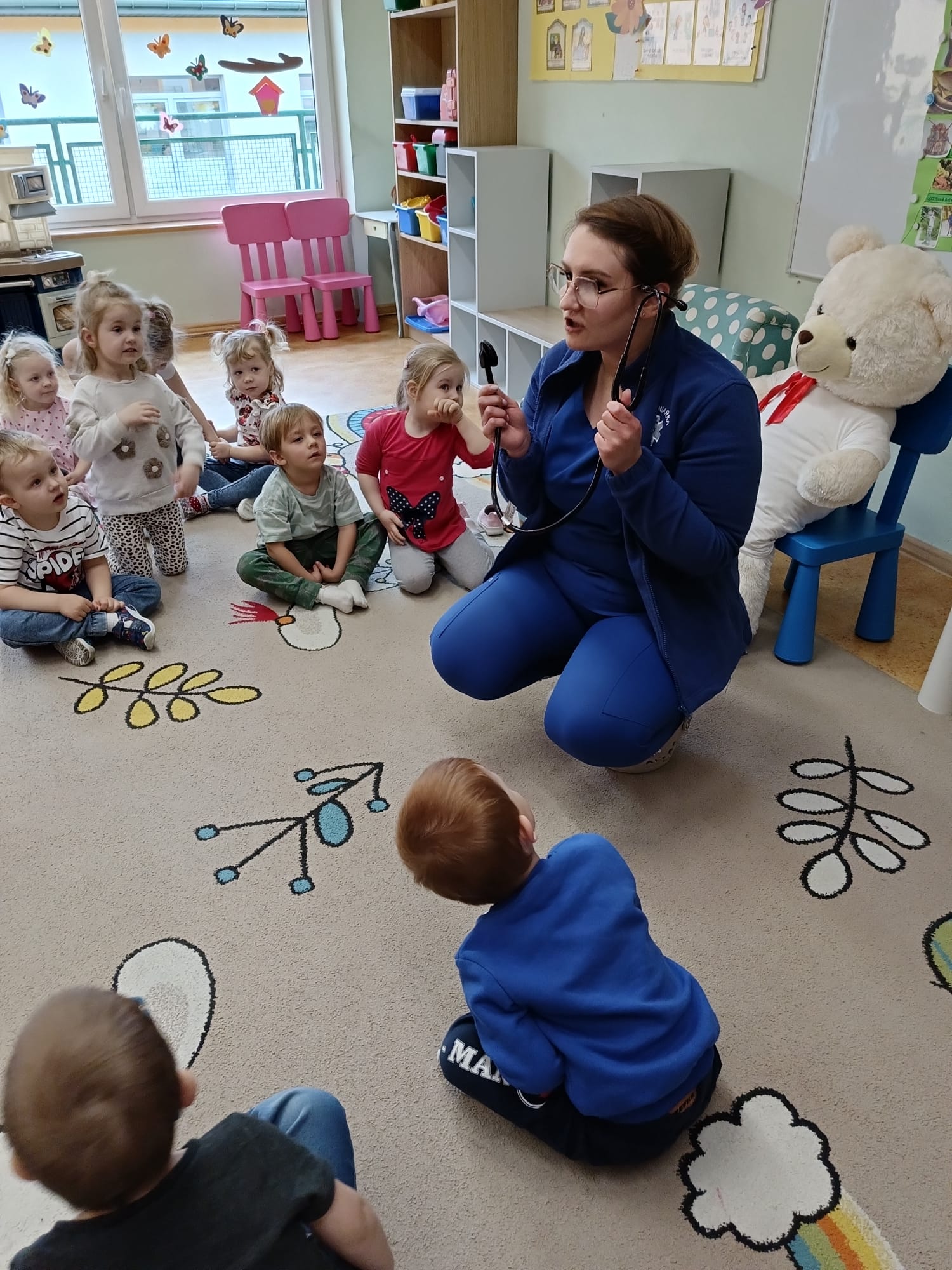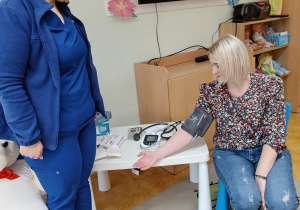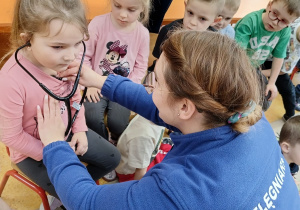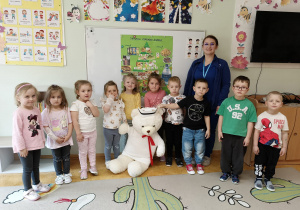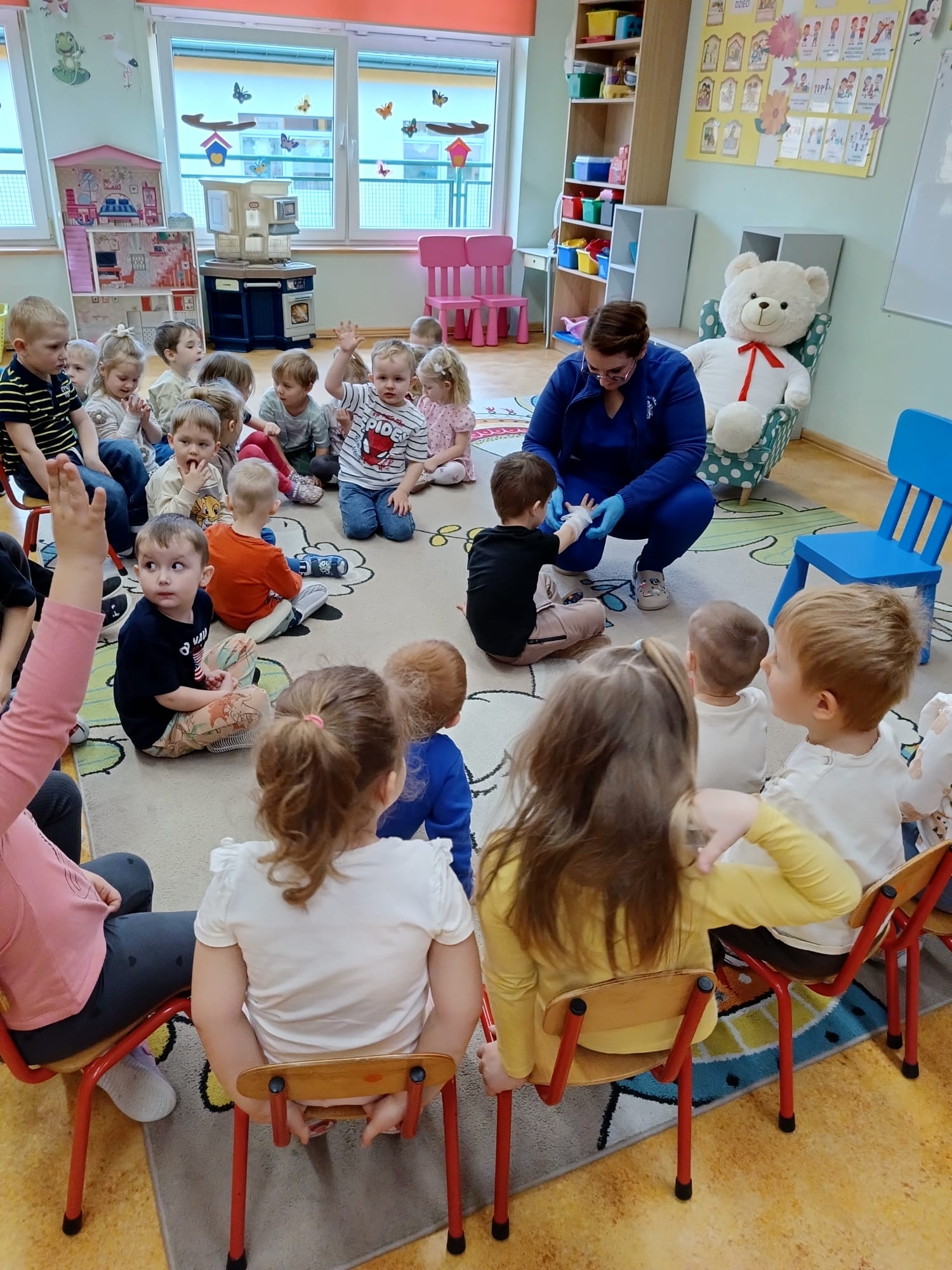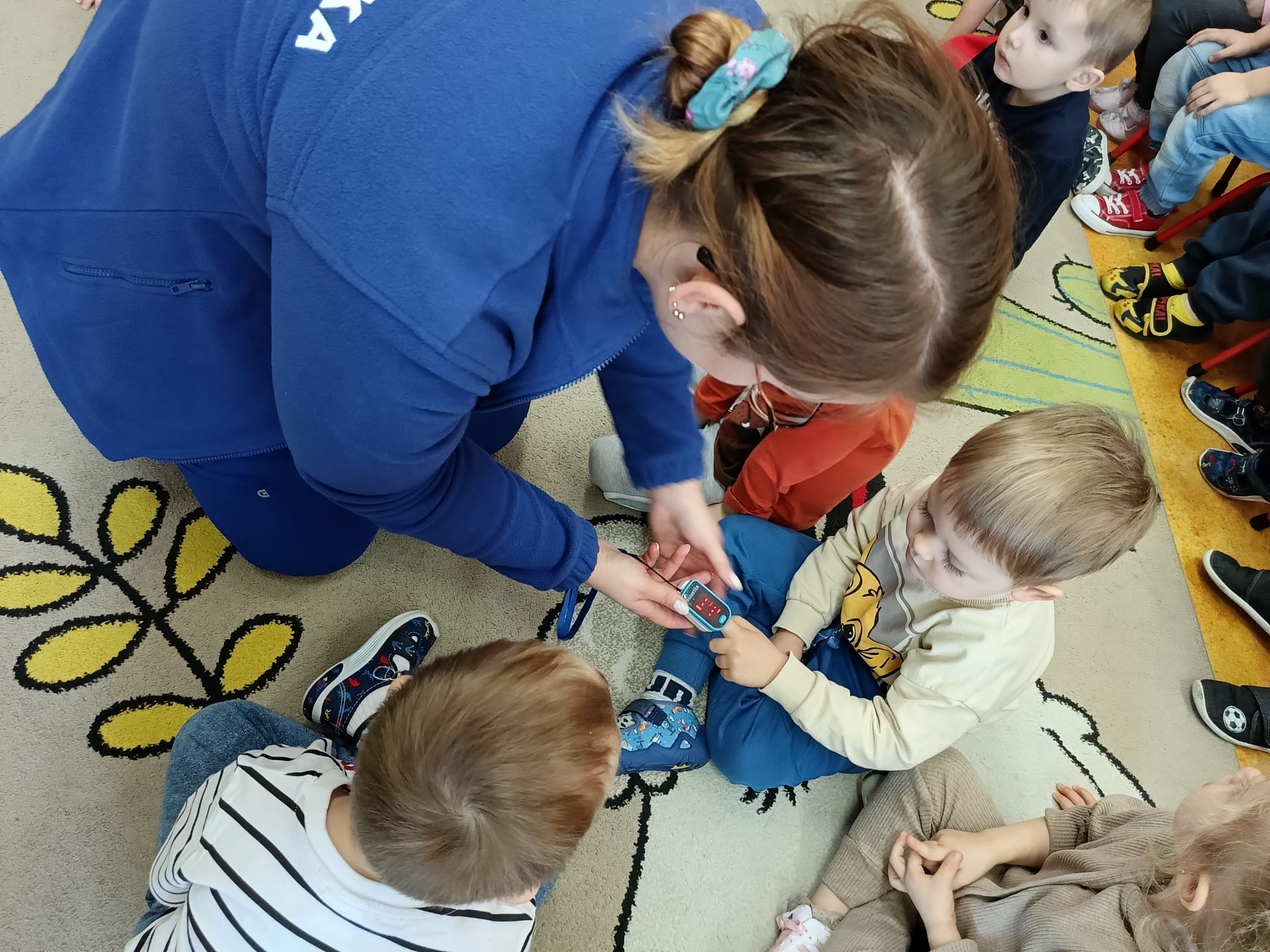 W piątek 27 marca przybył do grupy Krasnali i Motylków, niecodzienny gość – pielęgniarka Pani Karolina Dubiel. Pani Karolina opowiedziała dzieciom na czym polega jej praca, zaprezentowała atrybuty jakimi posługuje się w codziennej pracy, przekazała też informacje jak dbać o zdrowie i higienę. Przedszkolaki uczyły się jak opatrzyć ranę, założyć opaskę uciskową, przykleić plaster, zmierzyć ciśnienie, zrobić zastrzyk, przy pomocy stetoskopu wysłuchiwały bicia serca. Tak praktyczną i zarazem atrakcyjną lekcję z pewnością dzieci zapamiętają na długo. Serdecznie dziękujemy pani Karolinie za poświęcony nam czas. Wizyta pani pielęgniarki zakończyła się pamiątkowym zdjęciem, a Pani Katarzyna Święcicka