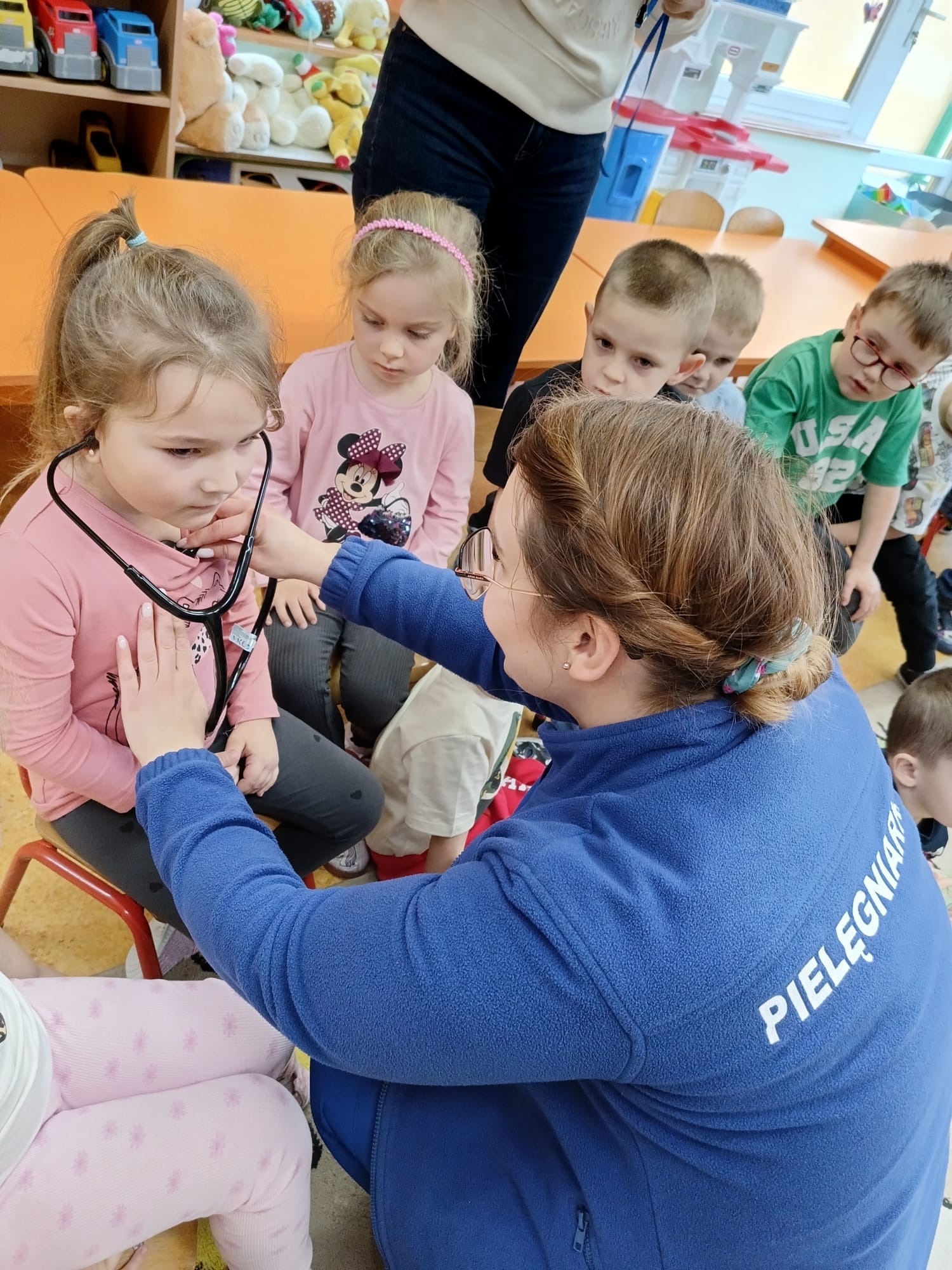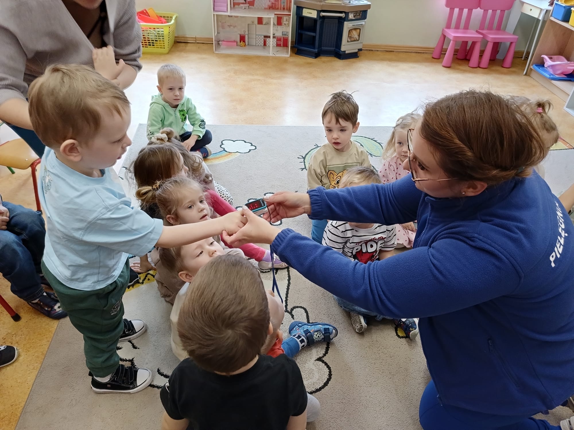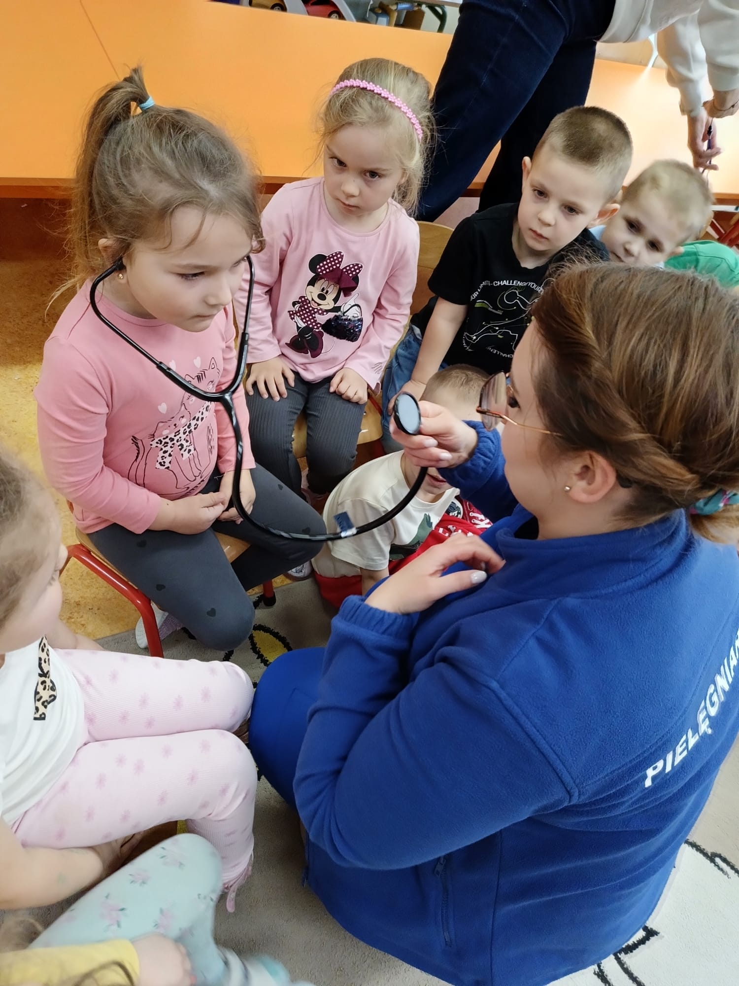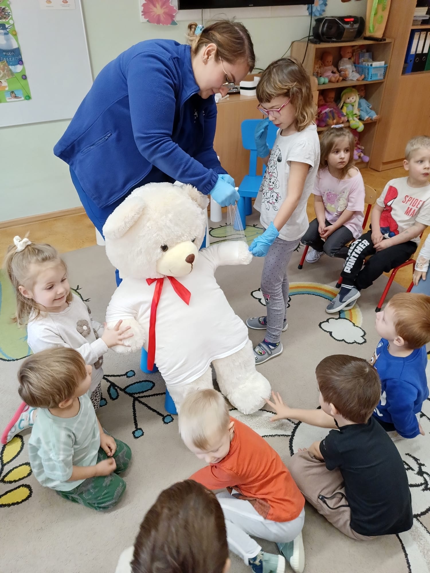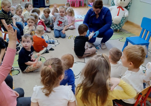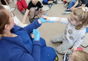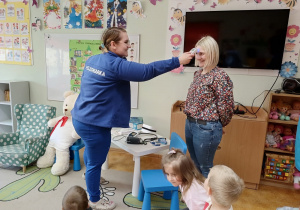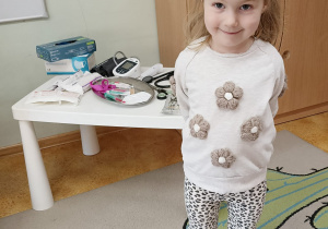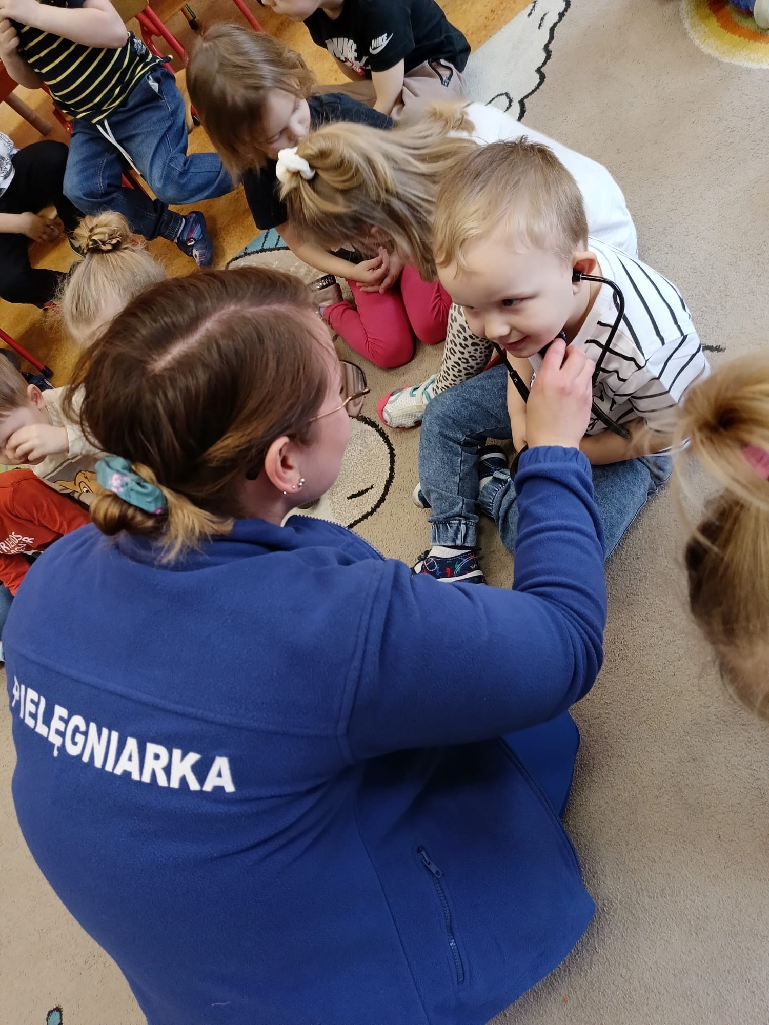 W piątek 27 marca przybył do grupy Krasnali i Motylków, niecodzienny gość – pielęgniarka Pani Karolina Dubiel. Pani Karolina opowiedziała dzieciom na czym polega jej praca, zaprezentowała atrybuty jakimi posługuje się w codziennej pracy, przekazała też informacje jak dbać o zdrowie i higienę. Przedszkolaki uczyły się jak opatrzyć ranę, założyć opaskę uciskową, przykleić plaster, zmierzyć ciśnienie, zrobić zastrzyk, przy pomocy stetoskopu wysłuchiwały bicia serca. Tak praktyczną i zarazem atrakcyjną lekcję z pewnością dzieci zapamiętają na długo. Serdecznie dziękujemy pani Karolinie za poświęcony nam czas. Wizyta pani pielęgniarki zakończyła się pamiątkowym zdjęciem, a Pani Katarzyna Święcicka