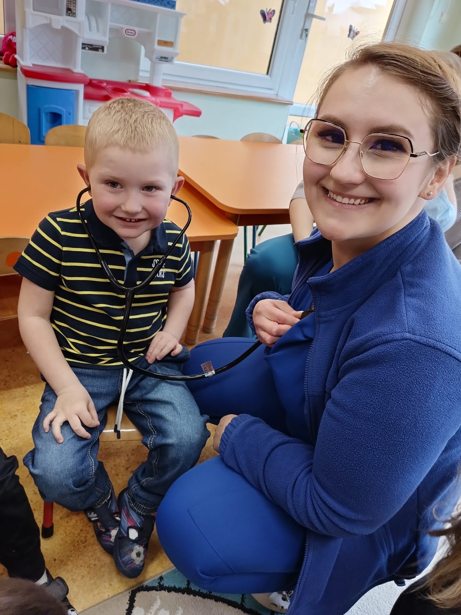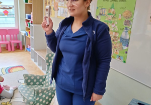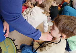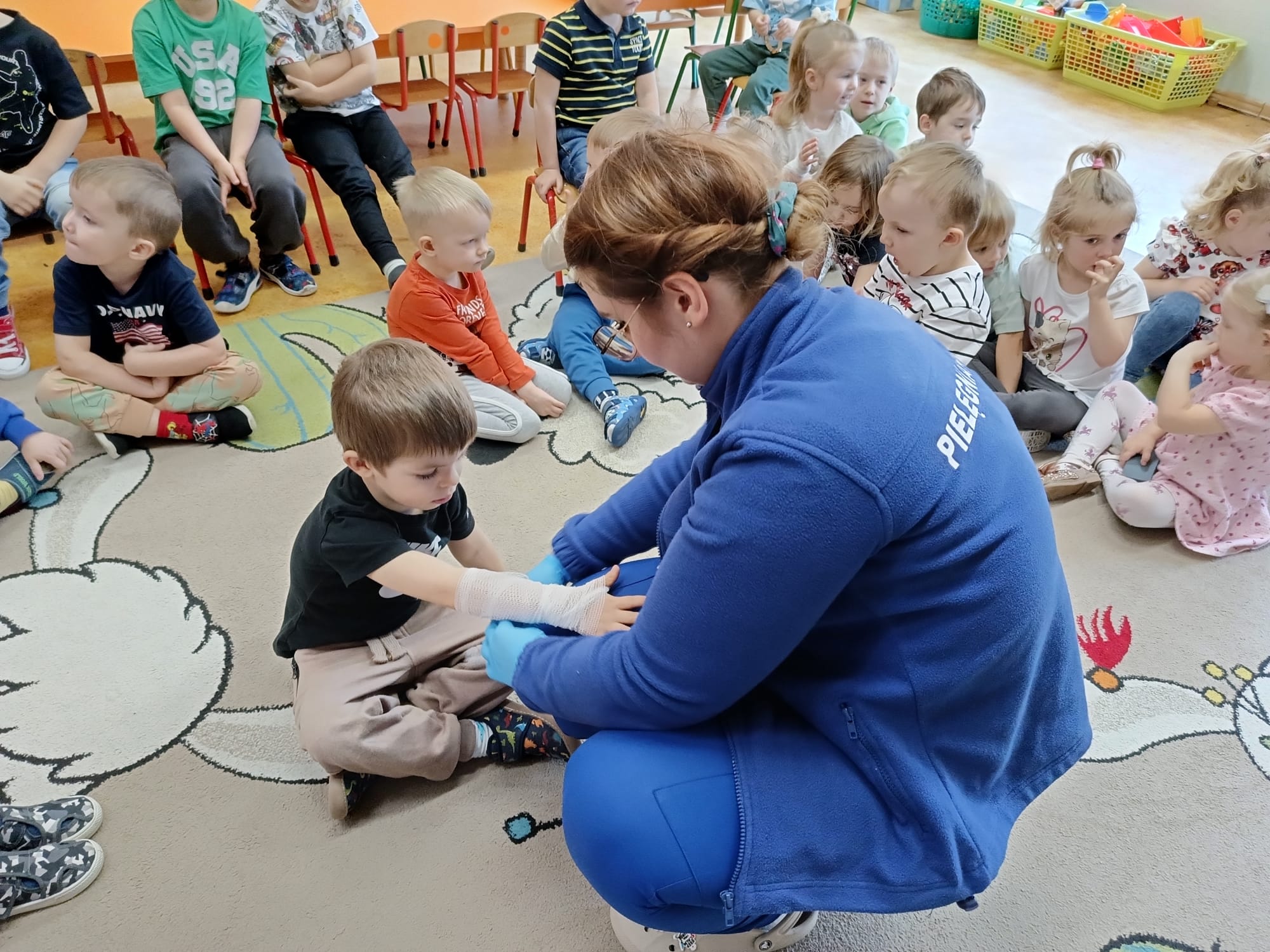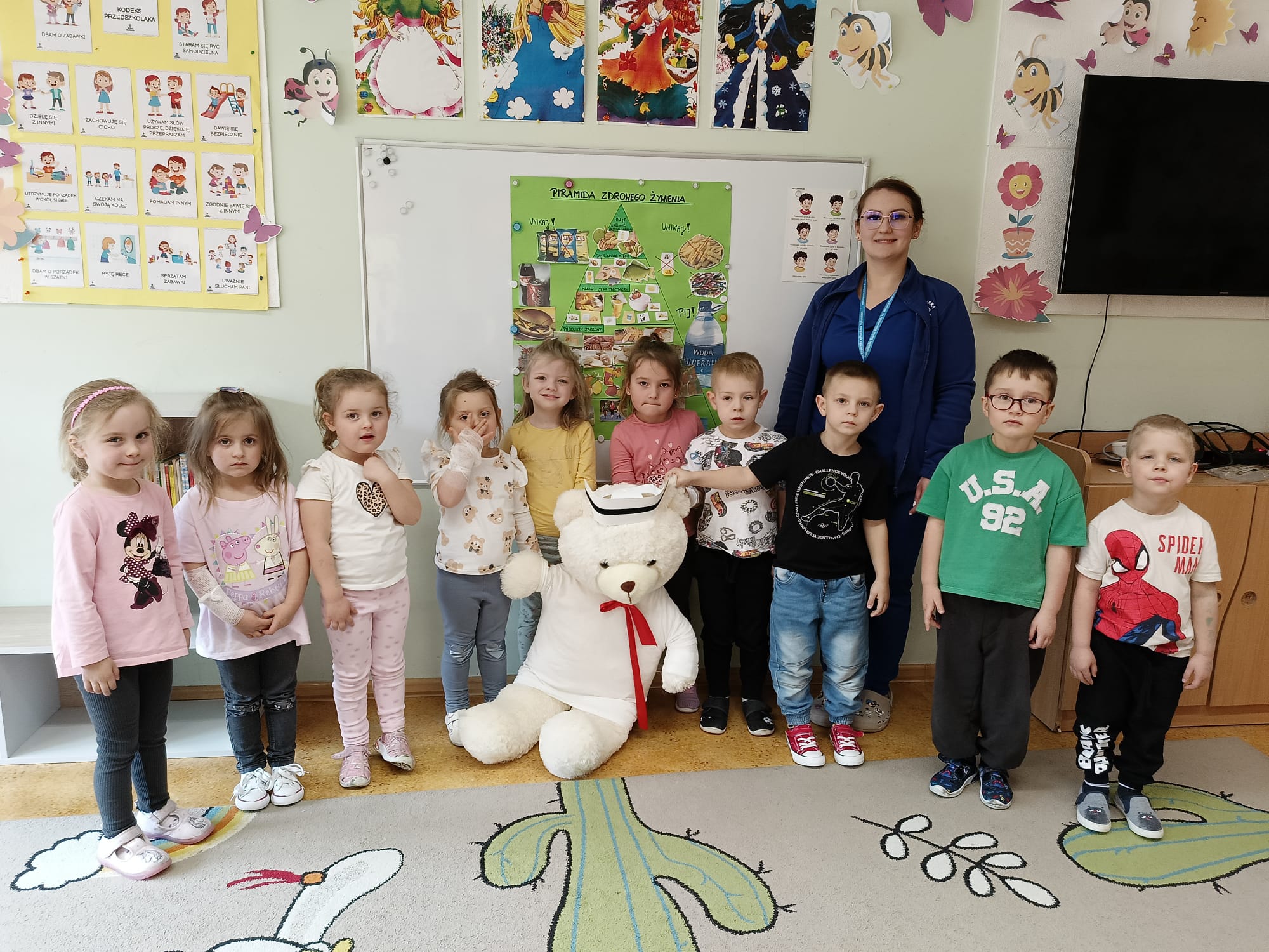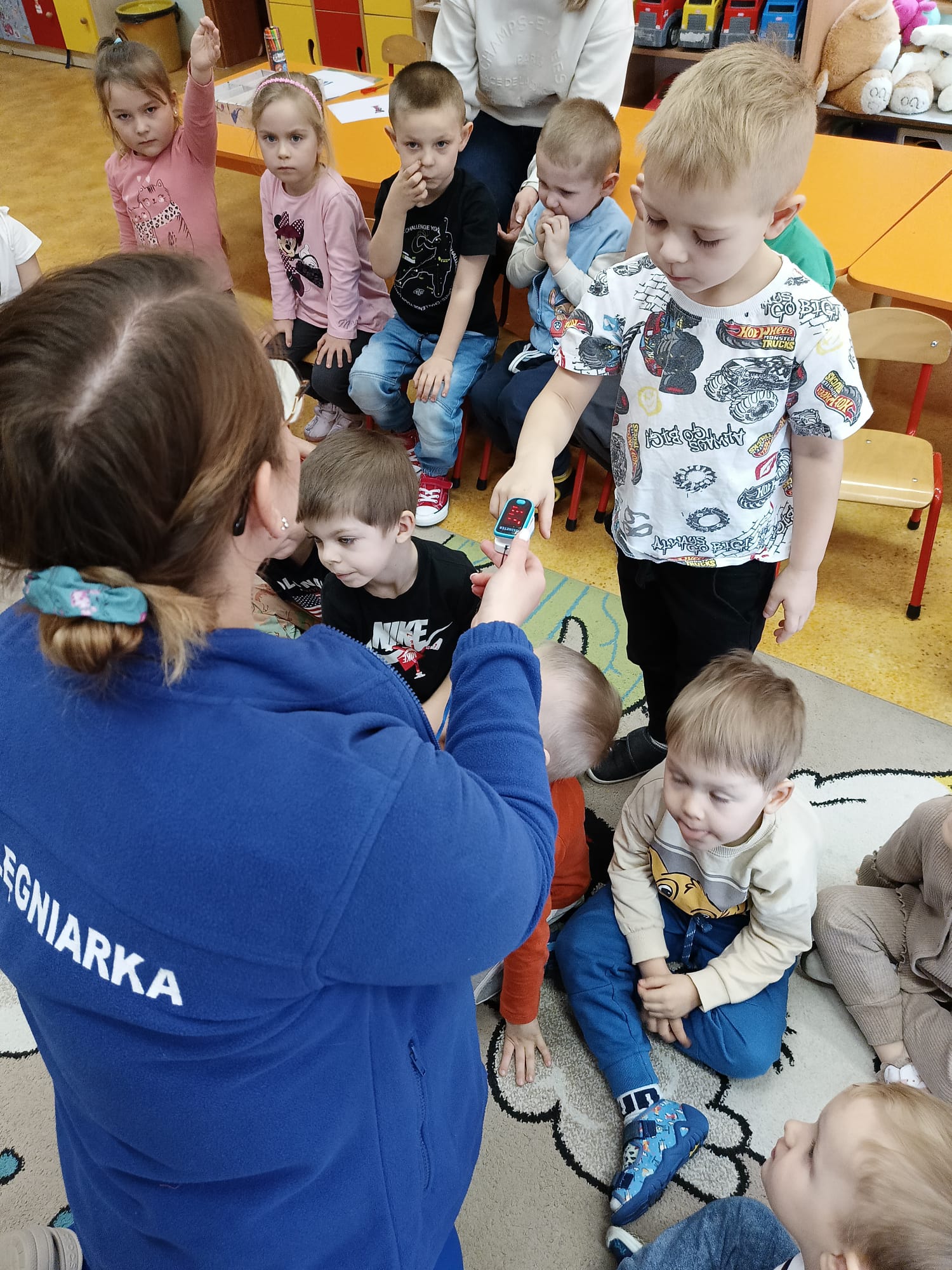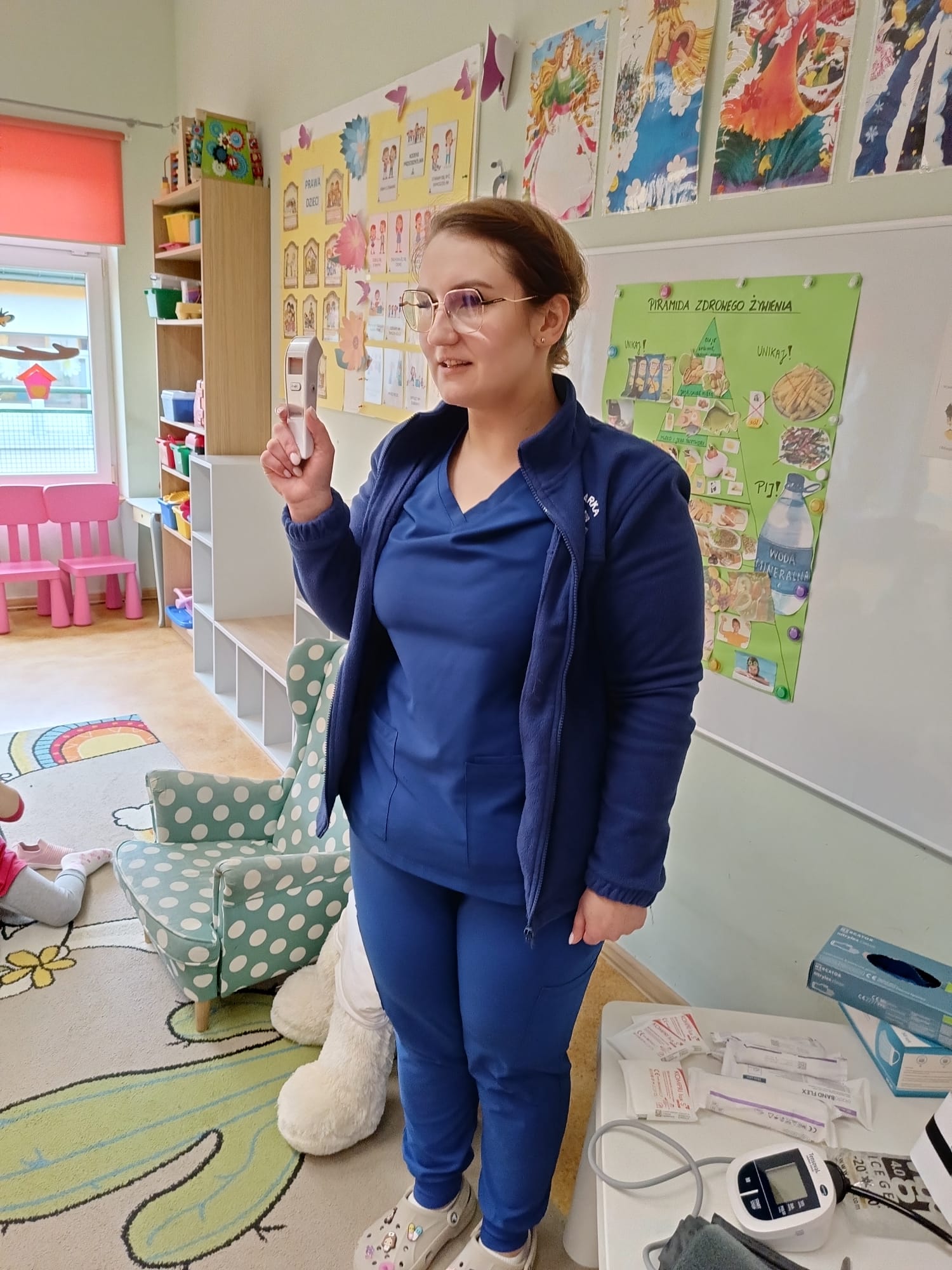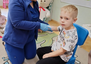W piątek 27 marca przybył do grupy Krasnali i Motylków, niecodzienny gość – pielęgniarka Pani Karolina Dubiel. Pani Karolina opowiedziała dzieciom na czym polega jej praca, zaprezentowała atrybuty jakimi posługuje się w codziennej pracy, przekazała też informacje jak dbać o zdrowie i higienę. Przedszkolaki uczyły się jak opatrzyć ranę, założyć opaskę uciskową, przykleić plaster, zmierzyć ciśnienie, zrobić zastrzyk, przy pomocy stetoskopu wysłuchiwały bicia serca. Tak praktyczną i zarazem atrakcyjną lekcję z pewnością dzieci zapamiętają na długo. Serdecznie dziękujemy pani Karolinie za poświęcony nam czas. Wizyta pani pielęgniarki zakończyła się pamiątkowym zdjęciem, a Pani Katarzyna Święcicka