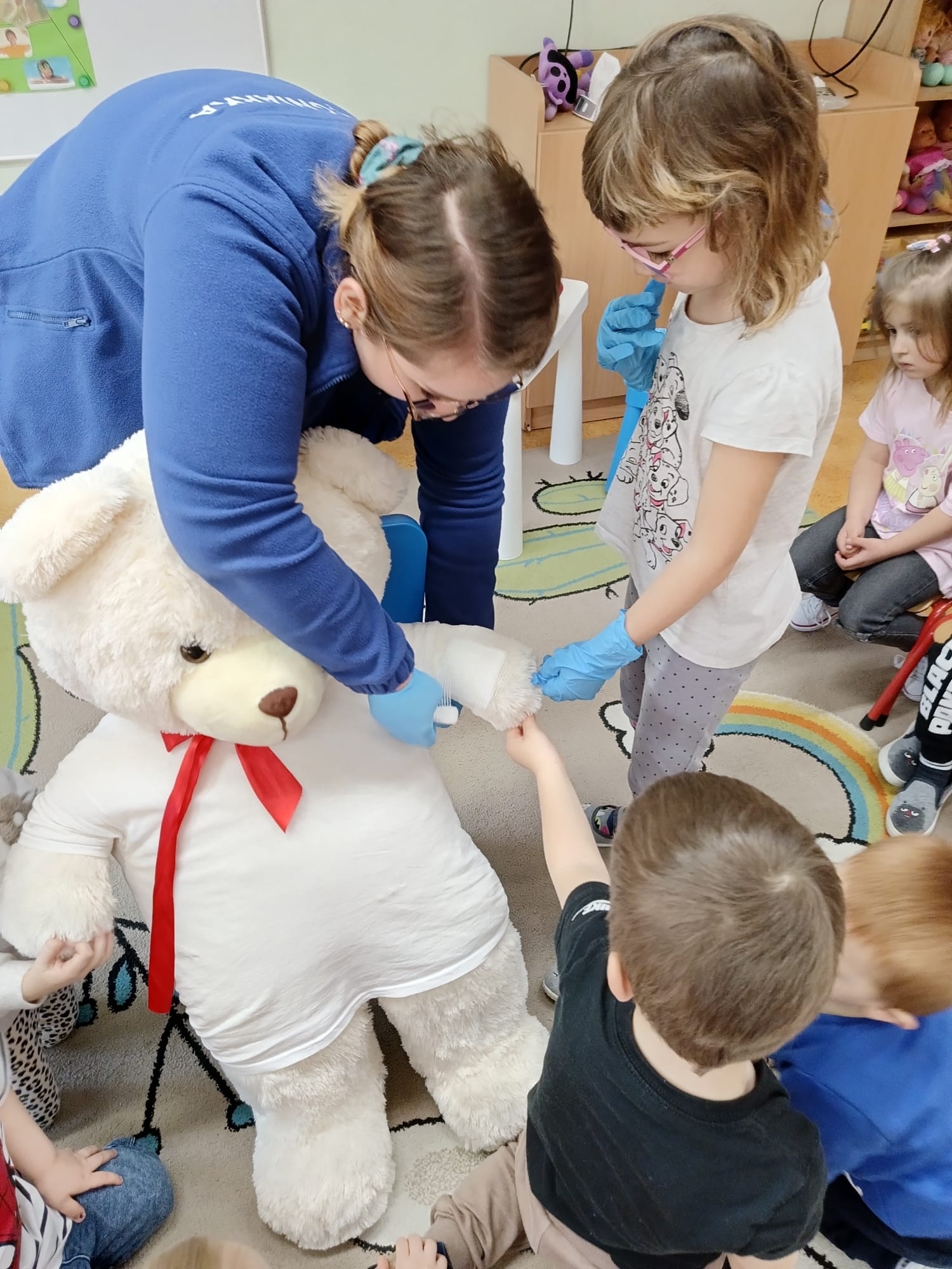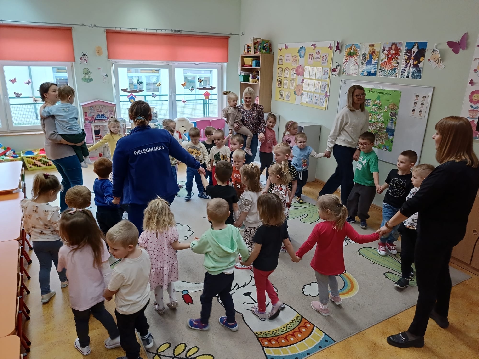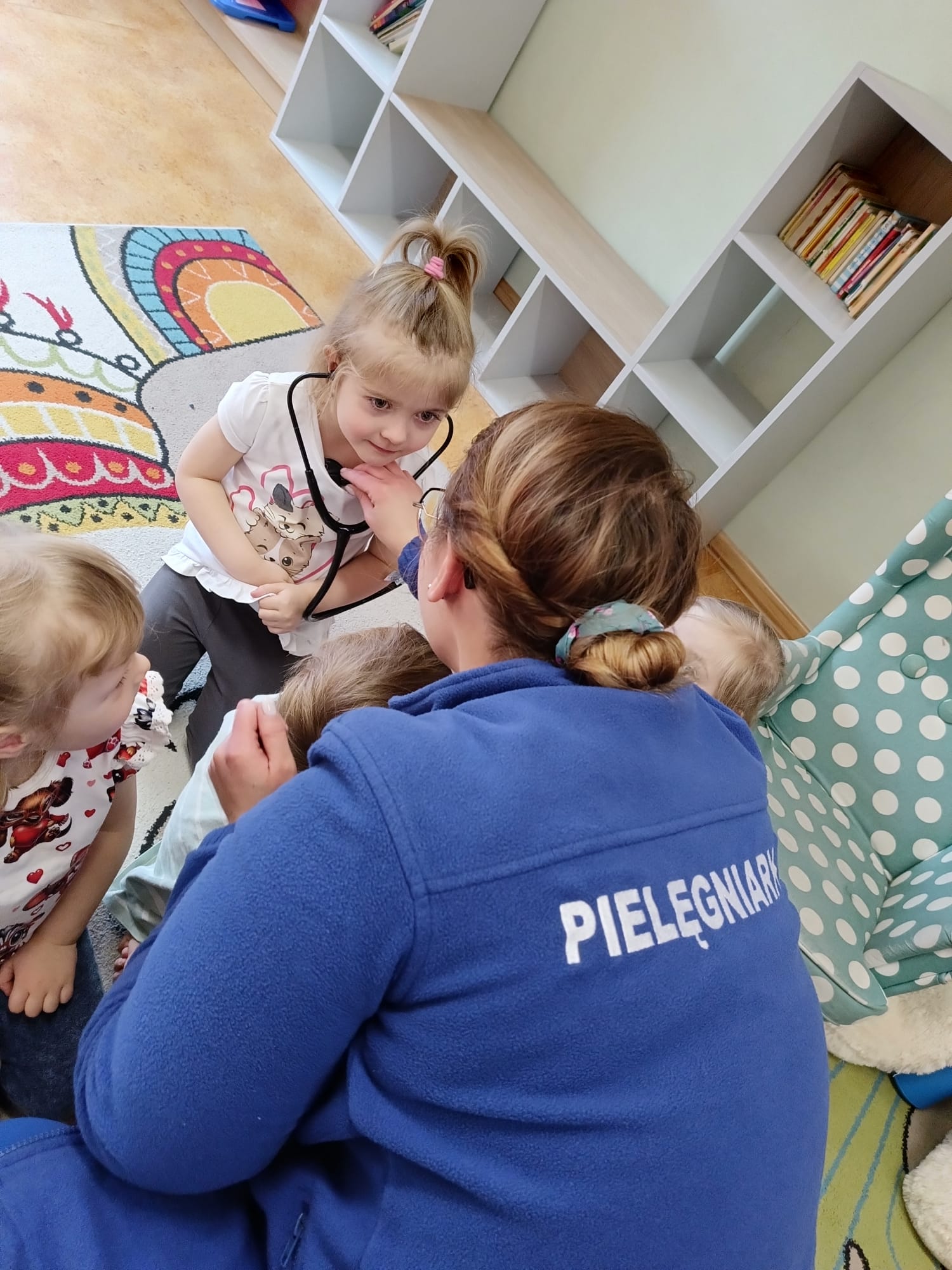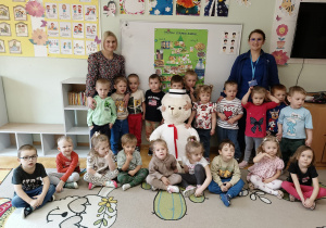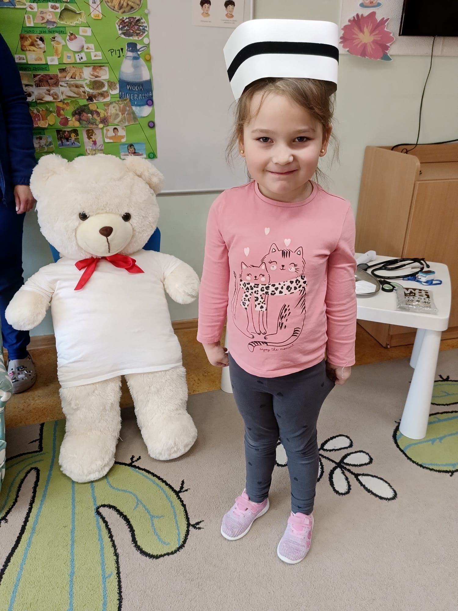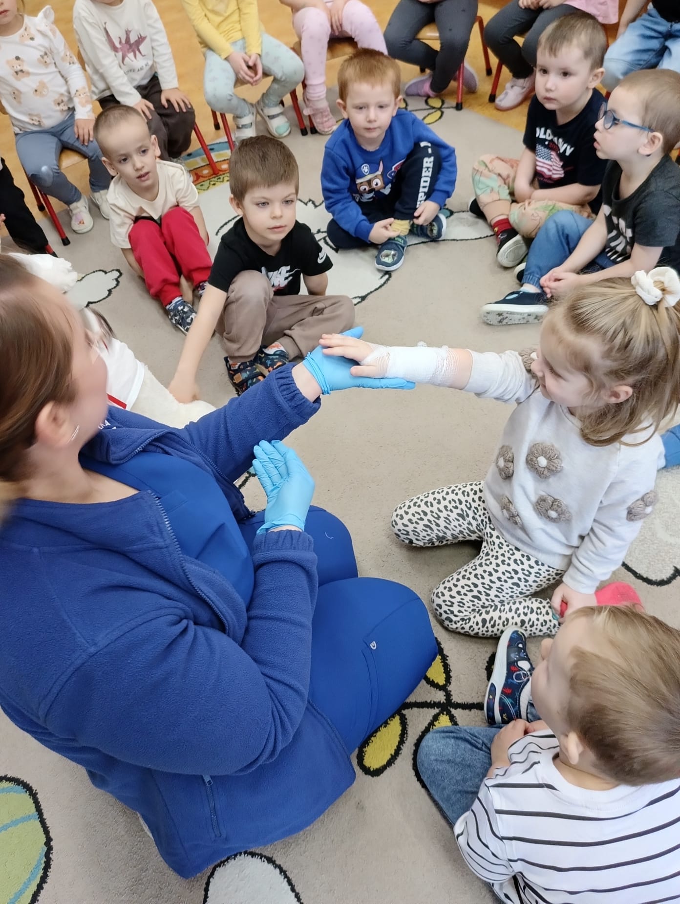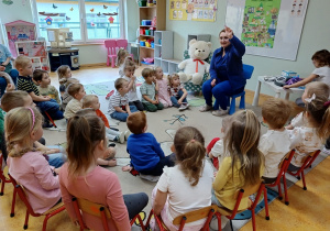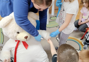 W piątek 27 marca przybył do grupy Krasnali i Motylków, niecodzienny gość – pielęgniarka Pani Karolina Dubiel. Pani Karolina opowiedziała dzieciom na czym polega jej praca, zaprezentowała atrybuty jakimi posługuje się w codziennej pracy, przekazała też informacje jak dbać o zdrowie i higienę. Przedszkolaki uczyły się jak opatrzyć ranę, założyć opaskę uciskową, przykleić plaster, zmierzyć ciśnienie, zrobić zastrzyk, przy pomocy stetoskopu wysłuchiwały bicia serca. Tak praktyczną i zarazem atrakcyjną lekcję z pewnością dzieci zapamiętają na długo. Serdecznie dziękujemy pani Karolinie za poświęcony nam czas. Wizyta pani pielęgniarki zakończyła się pamiątkowym zdjęciem, a Pani Katarzyna Święcicka