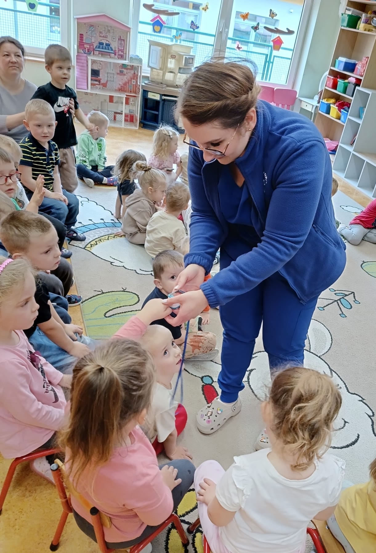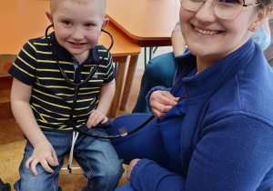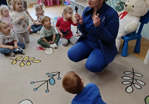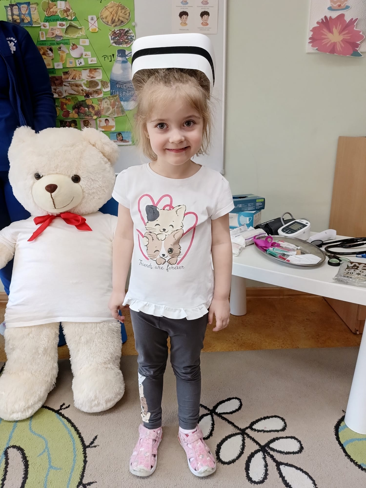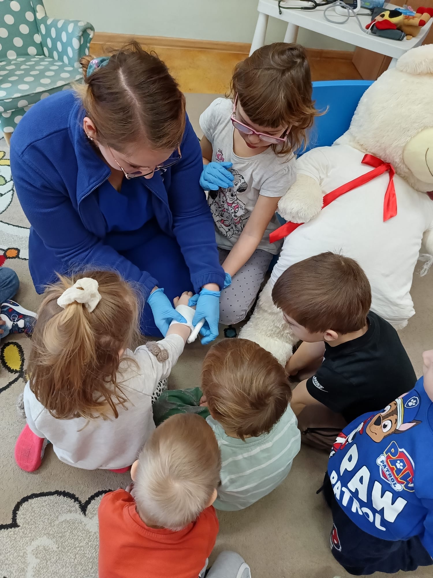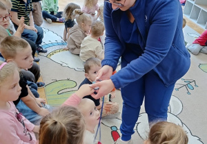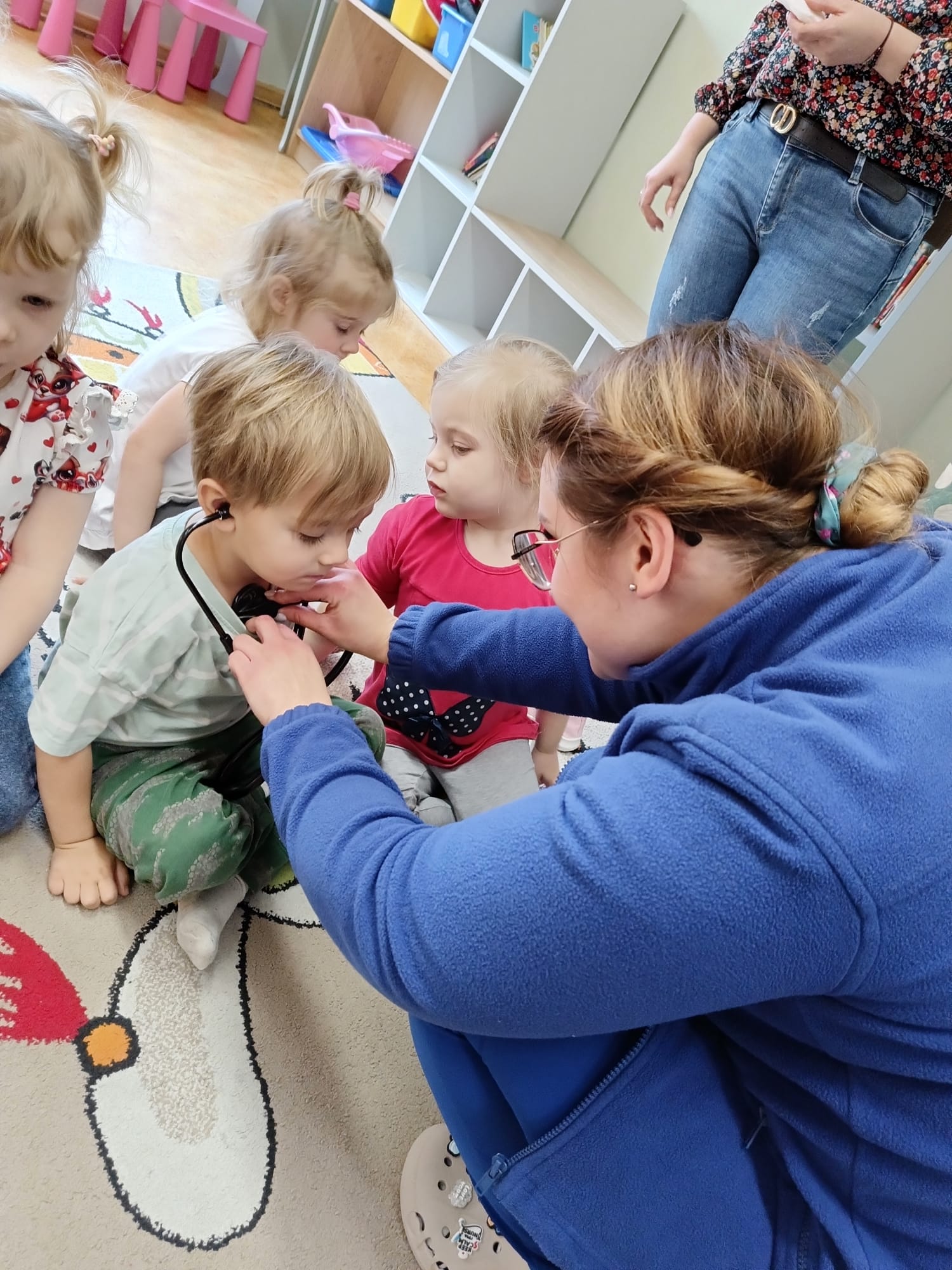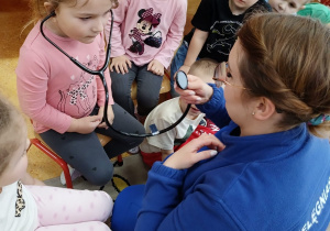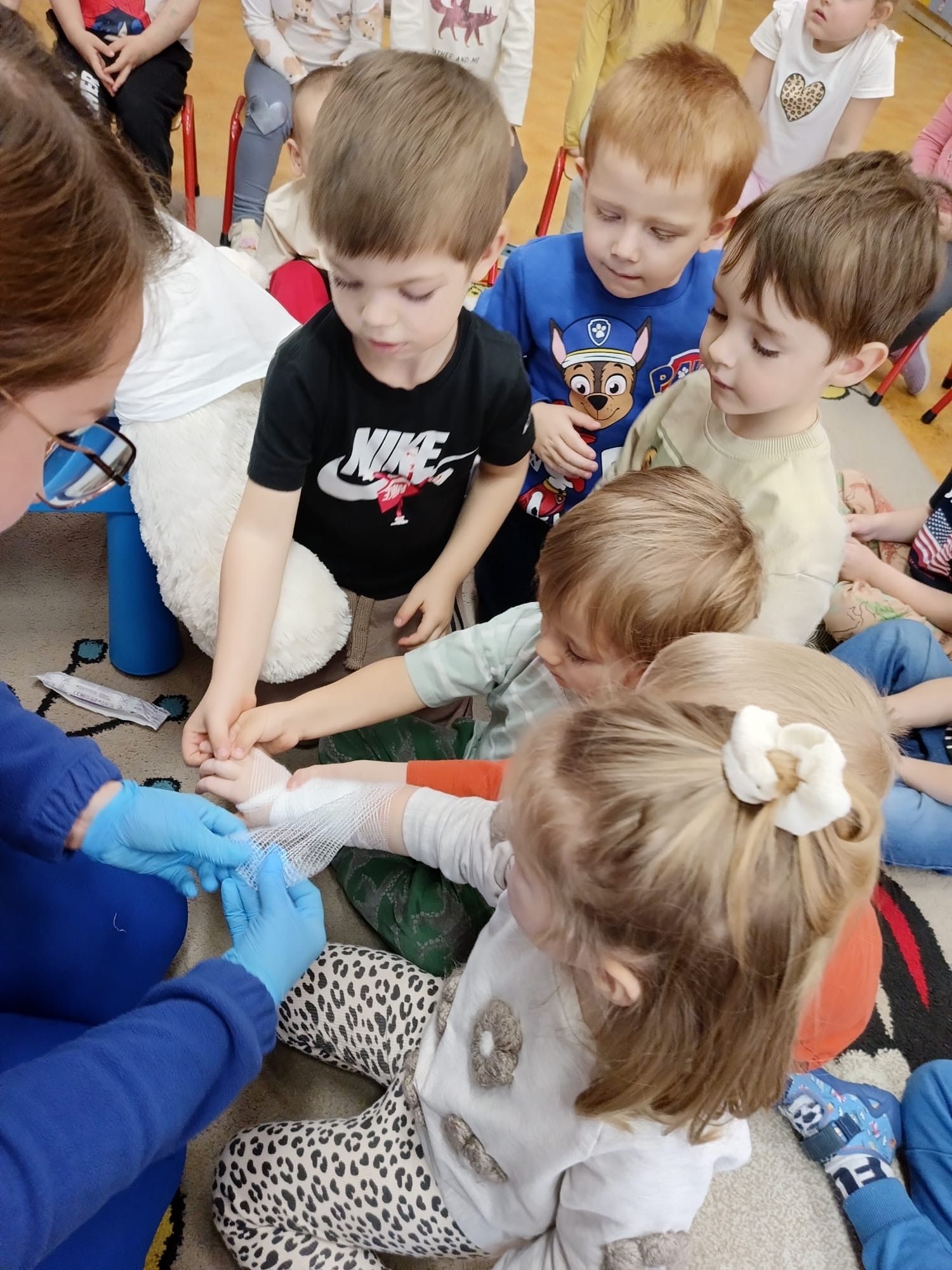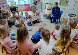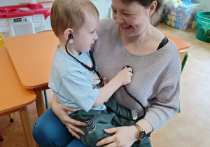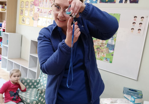 W piątek 27 marca przybył do grupy Krasnali i Motylków, niecodzienny gość – pielęgniarka Pani Karolina Dubiel. Pani Karolina opowiedziała dzieciom na czym polega jej praca, zaprezentowała atrybuty jakimi posługuje się w codziennej pracy, przekazała też informacje jak dbać o zdrowie i higienę. Przedszkolaki uczyły się jak opatrzyć ranę, założyć opaskę uciskową, przykleić plaster, zmierzyć ciśnienie, zrobić zastrzyk, przy pomocy stetoskopu wysłuchiwały bicia serca. Tak praktyczną i zarazem atrakcyjną lekcję z pewnością dzieci zapamiętają na długo. Serdecznie dziękujemy pani Karolinie za poświęcony nam czas. Wizyta pani pielęgniarki zakończyła się pamiątkowym zdjęciem, a Pani Katarzyna Święcicka