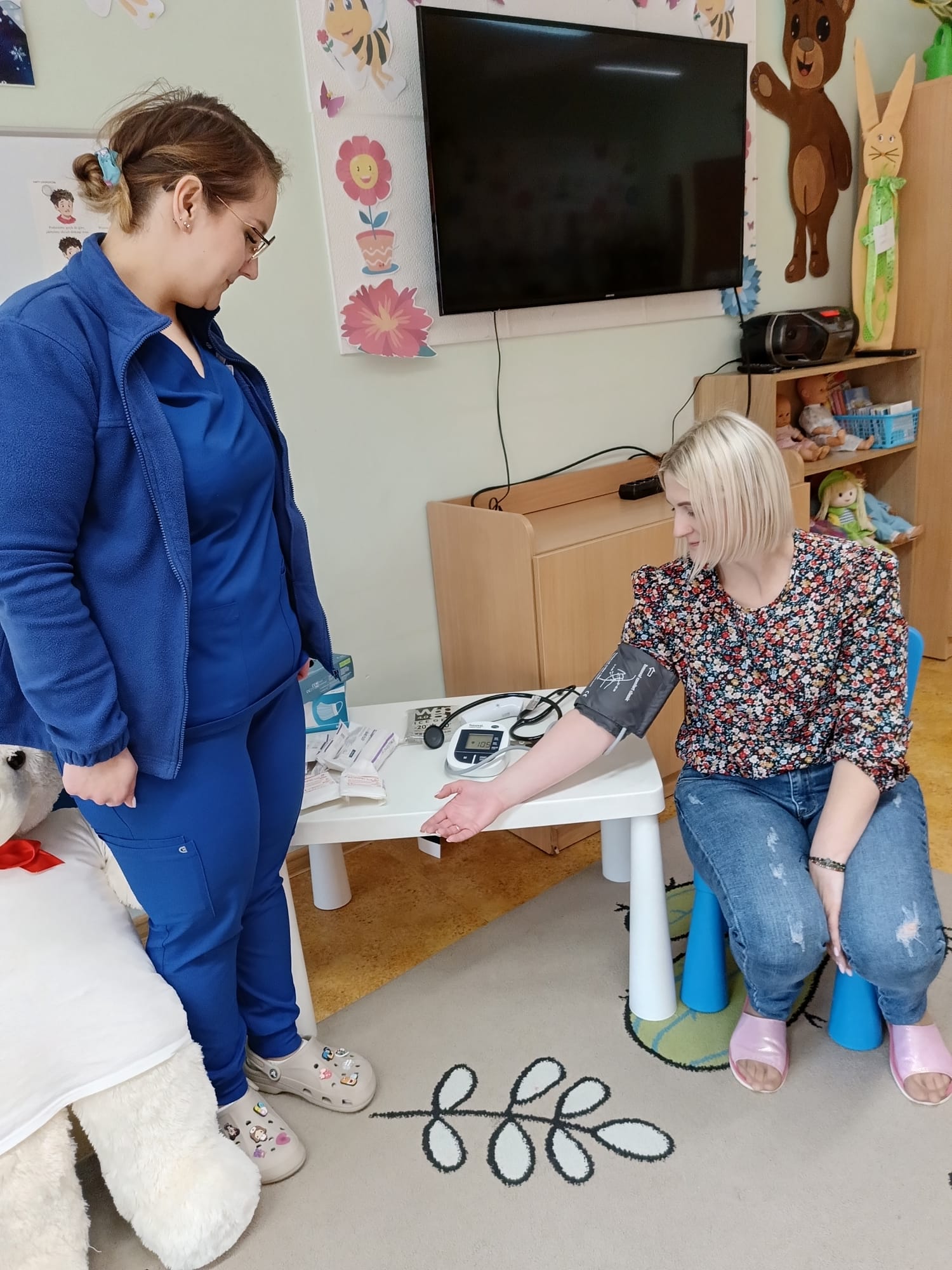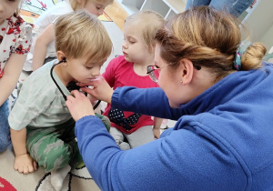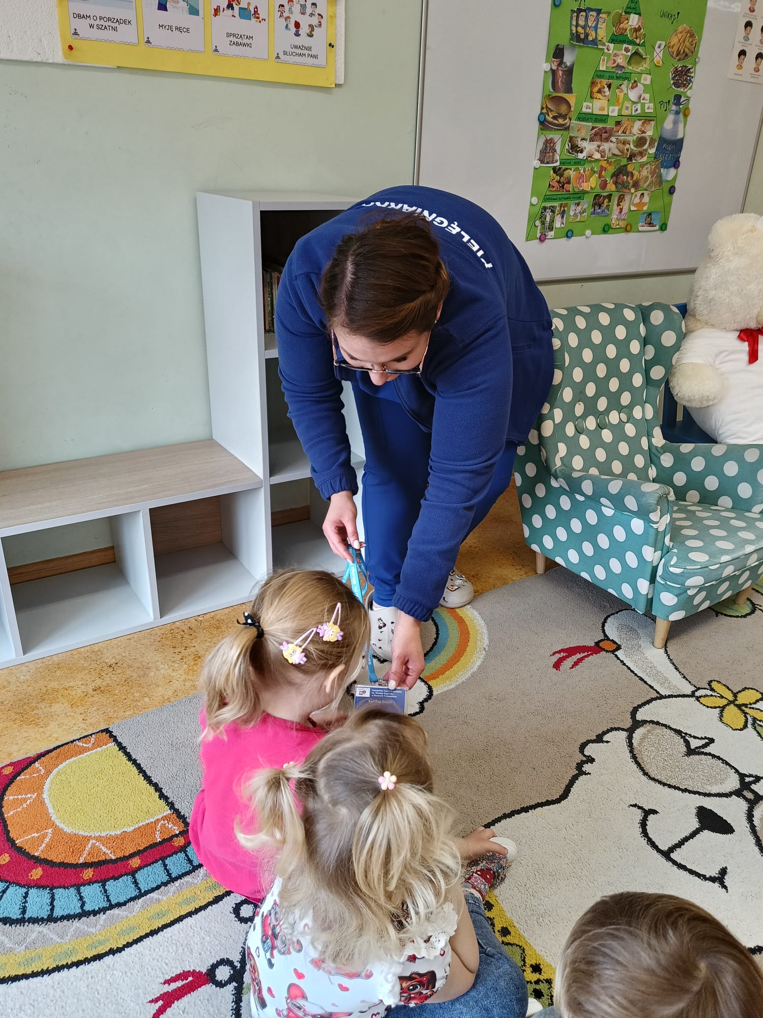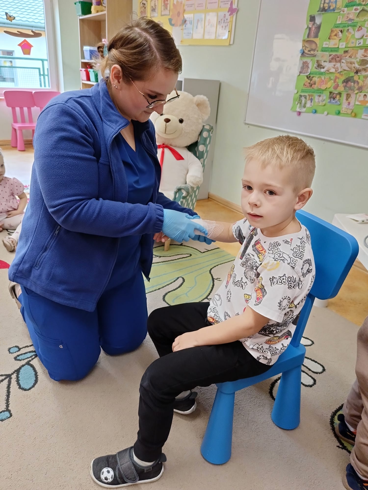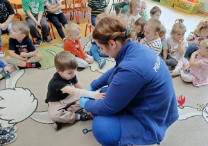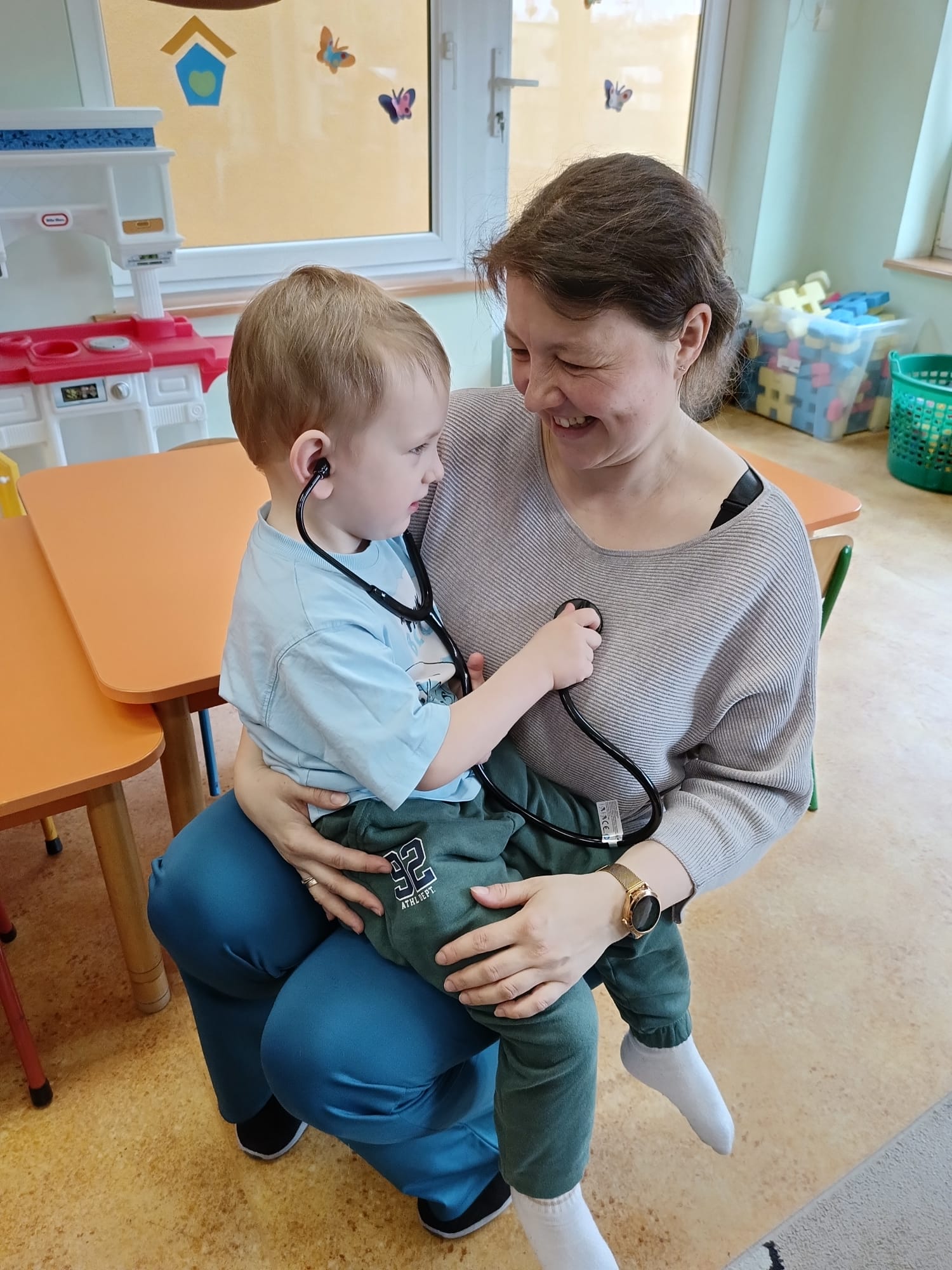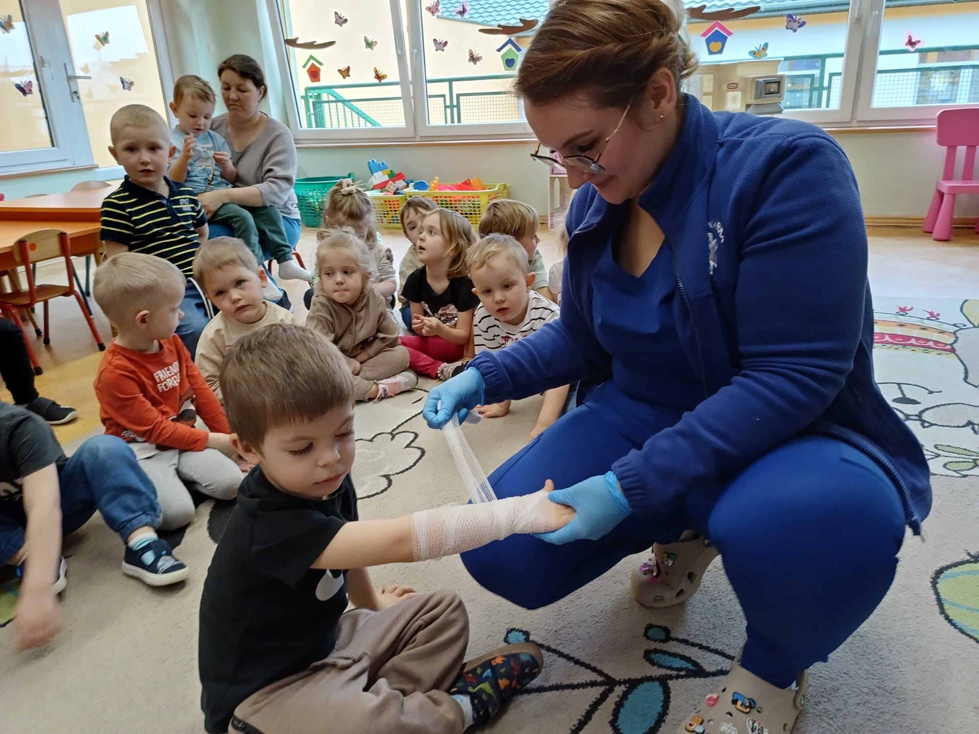 W piątek 27 marca przybył do grupy Krasnali i Motylków, niecodzienny gość – pielęgniarka Pani Karolina Dubiel. Pani Karolina opowiedziała dzieciom na czym polega jej praca, zaprezentowała atrybuty jakimi posługuje się w codziennej pracy, przekazała też informacje jak dbać o zdrowie i higienę. Przedszkolaki uczyły się jak opatrzyć ranę, założyć opaskę uciskową, przykleić plaster, zmierzyć ciśnienie, zrobić zastrzyk, przy pomocy stetoskopu wysłuchiwały bicia serca. Tak praktyczną i zarazem atrakcyjną lekcję z pewnością dzieci zapamiętają na długo. Serdecznie dziękujemy pani Karolinie za poświęcony nam czas. Wizyta pani pielęgniarki zakończyła się pamiątkowym zdjęciem, a Pani Katarzyna Święcicka