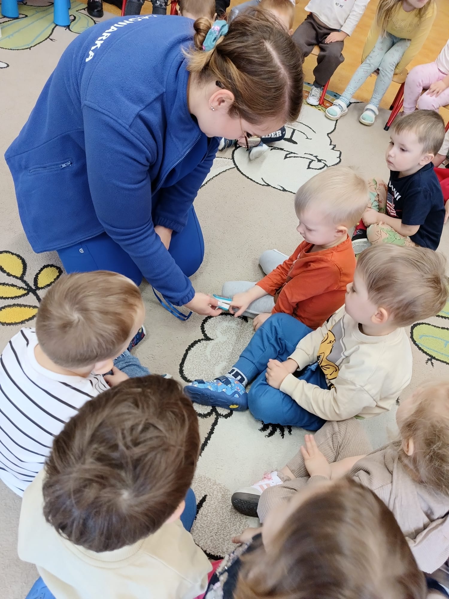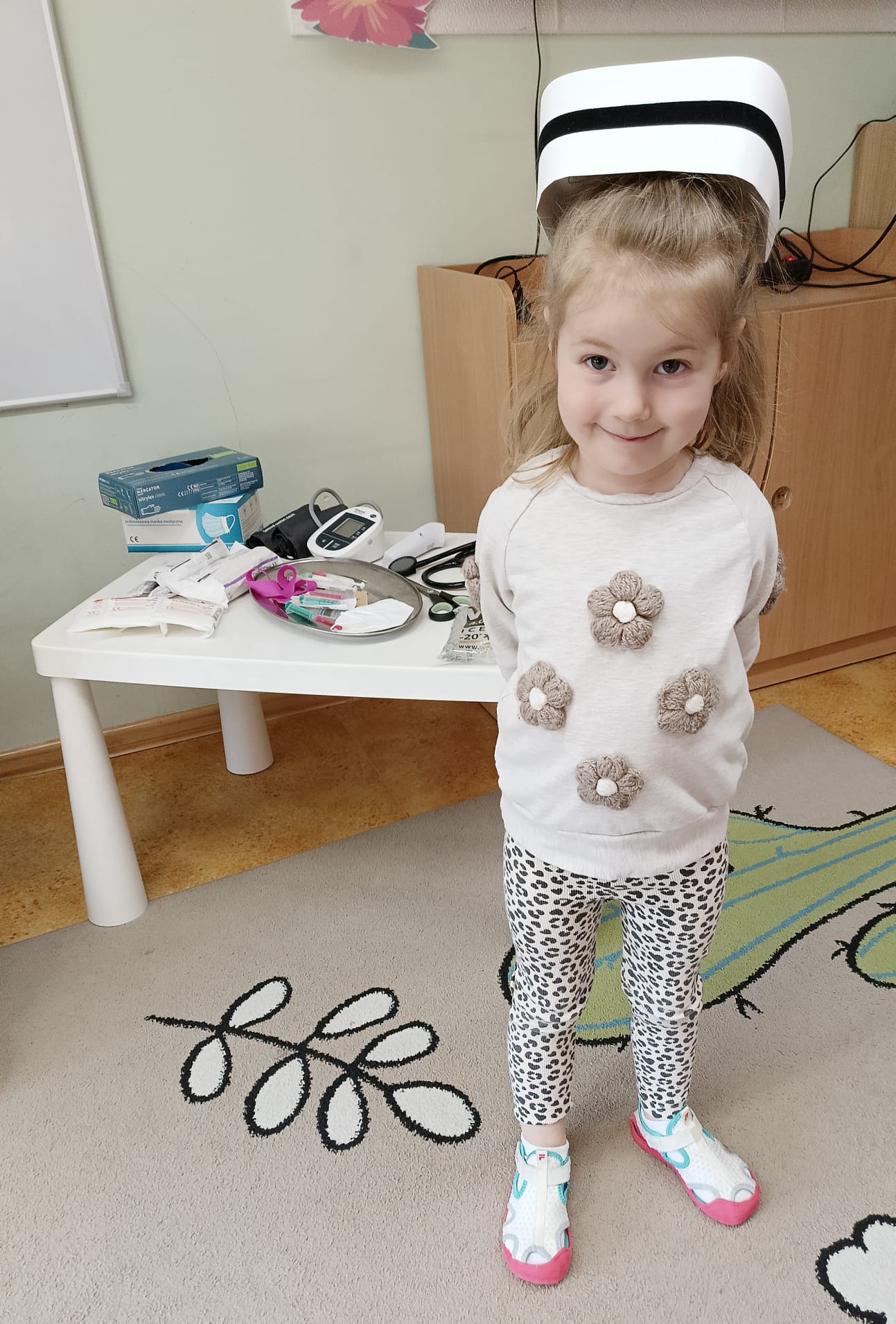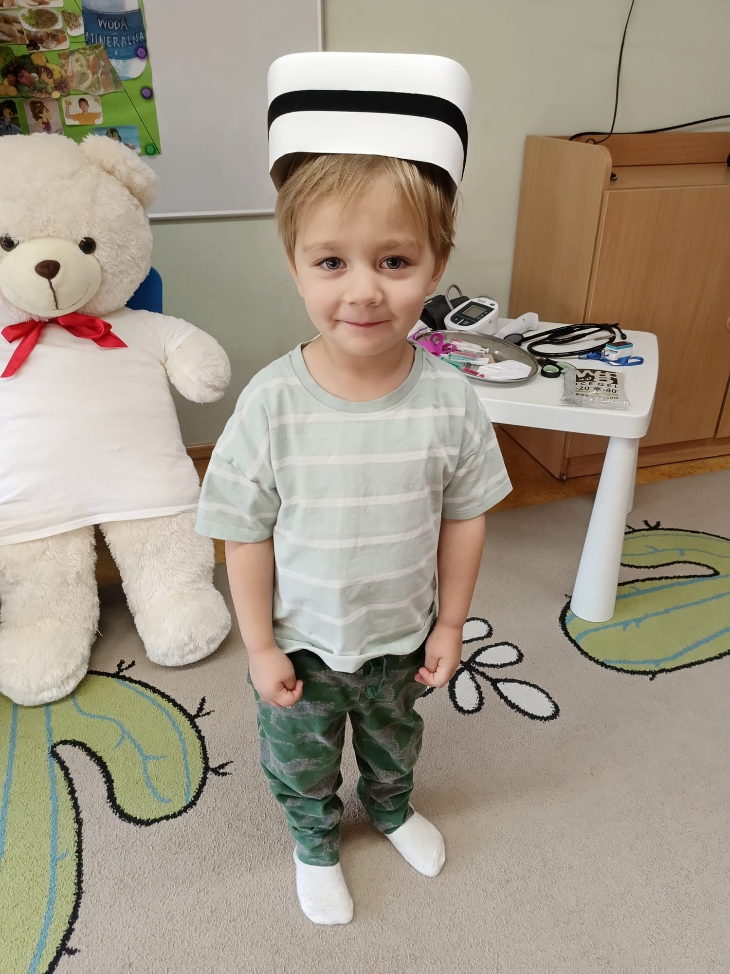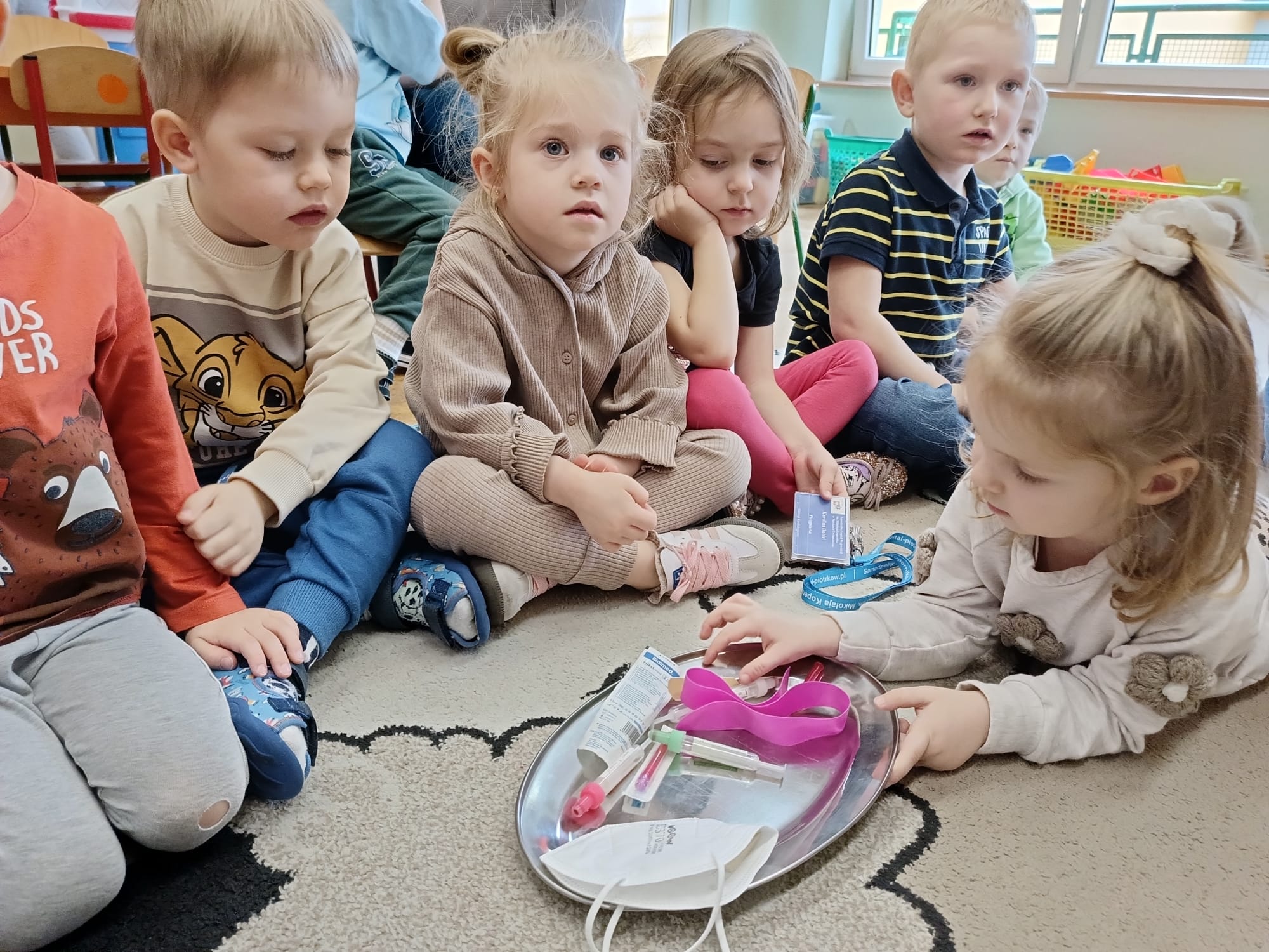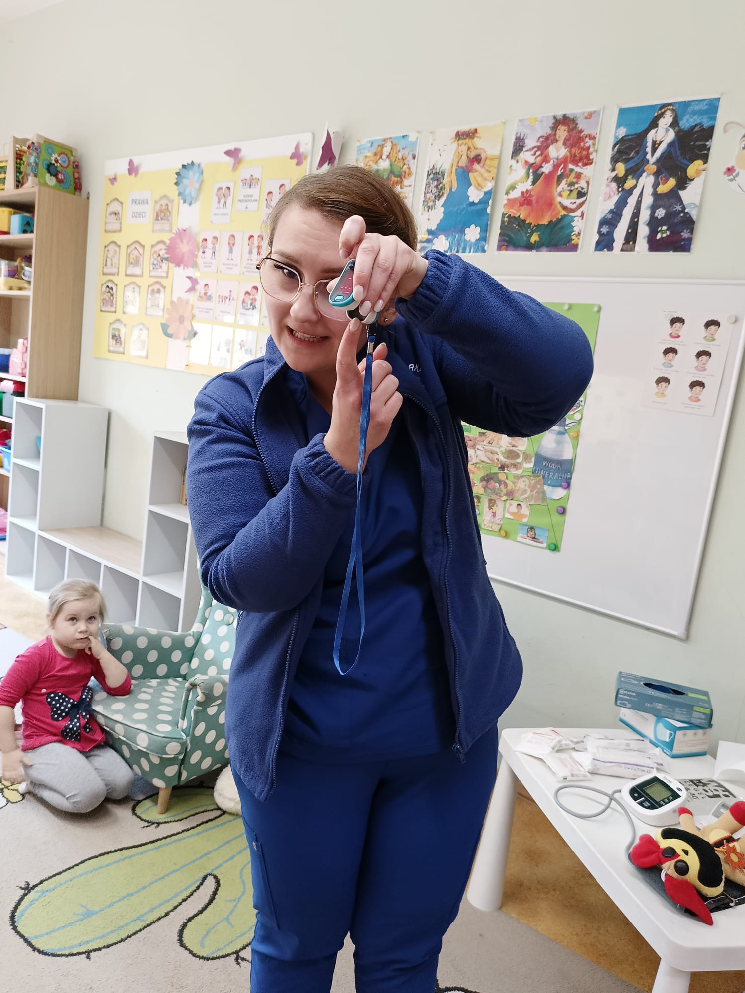 W piątek 27 marca przybył do grupy Krasnali i Motylków, niecodzienny gość – pielęgniarka Pani Karolina Dubiel. Pani Karolina opowiedziała dzieciom na czym polega jej praca, zaprezentowała atrybuty jakimi posługuje się w codziennej pracy, przekazała też informacje jak dbać o zdrowie i higienę. Przedszkolaki uczyły się jak opatrzyć ranę, założyć opaskę uciskową, przykleić plaster, zmierzyć ciśnienie, zrobić zastrzyk, przy pomocy stetoskopu wysłuchiwały bicia serca. Tak praktyczną i zarazem atrakcyjną lekcję z pewnością dzieci zapamiętają na długo. Serdecznie dziękujemy pani Karolinie za poświęcony nam czas. Wizyta pani pielęgniarki zakończyła się pamiątkowym zdjęciem, a Pani Katarzyna Święcicka
