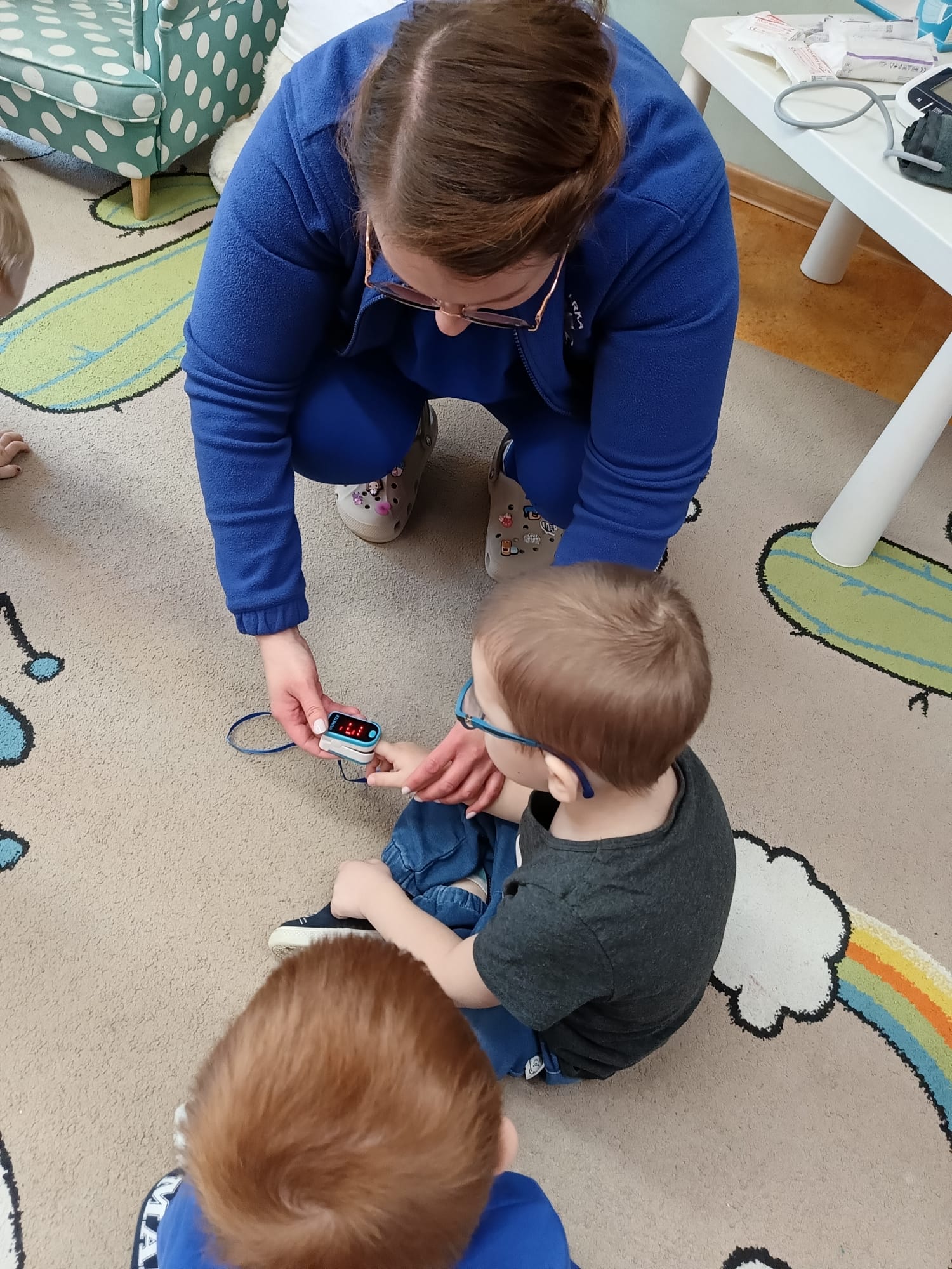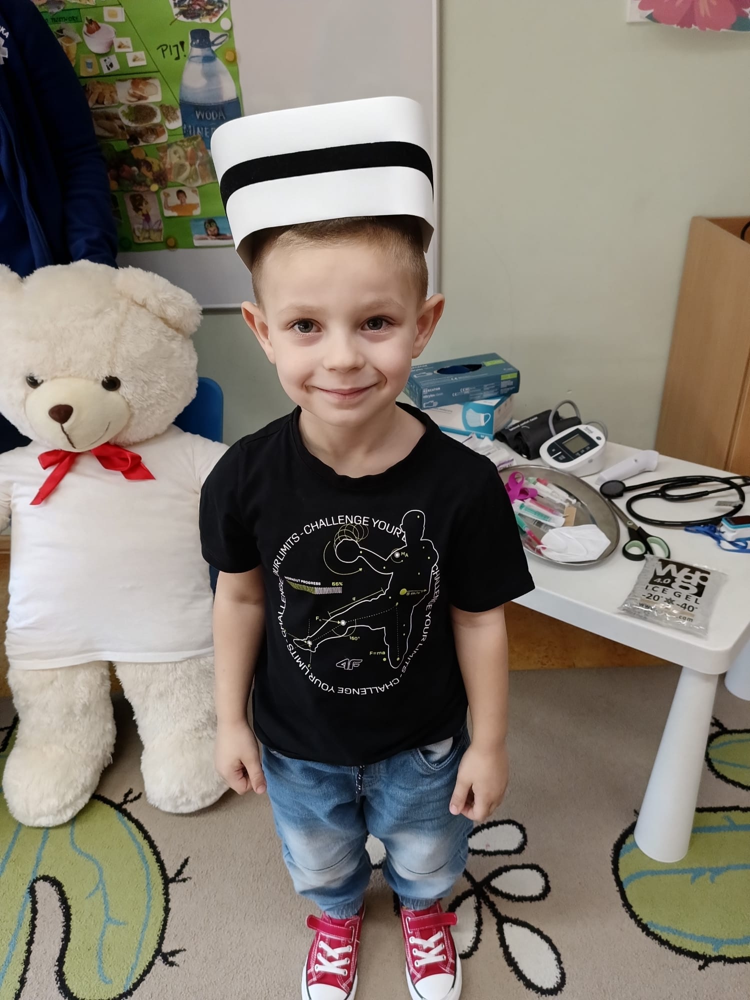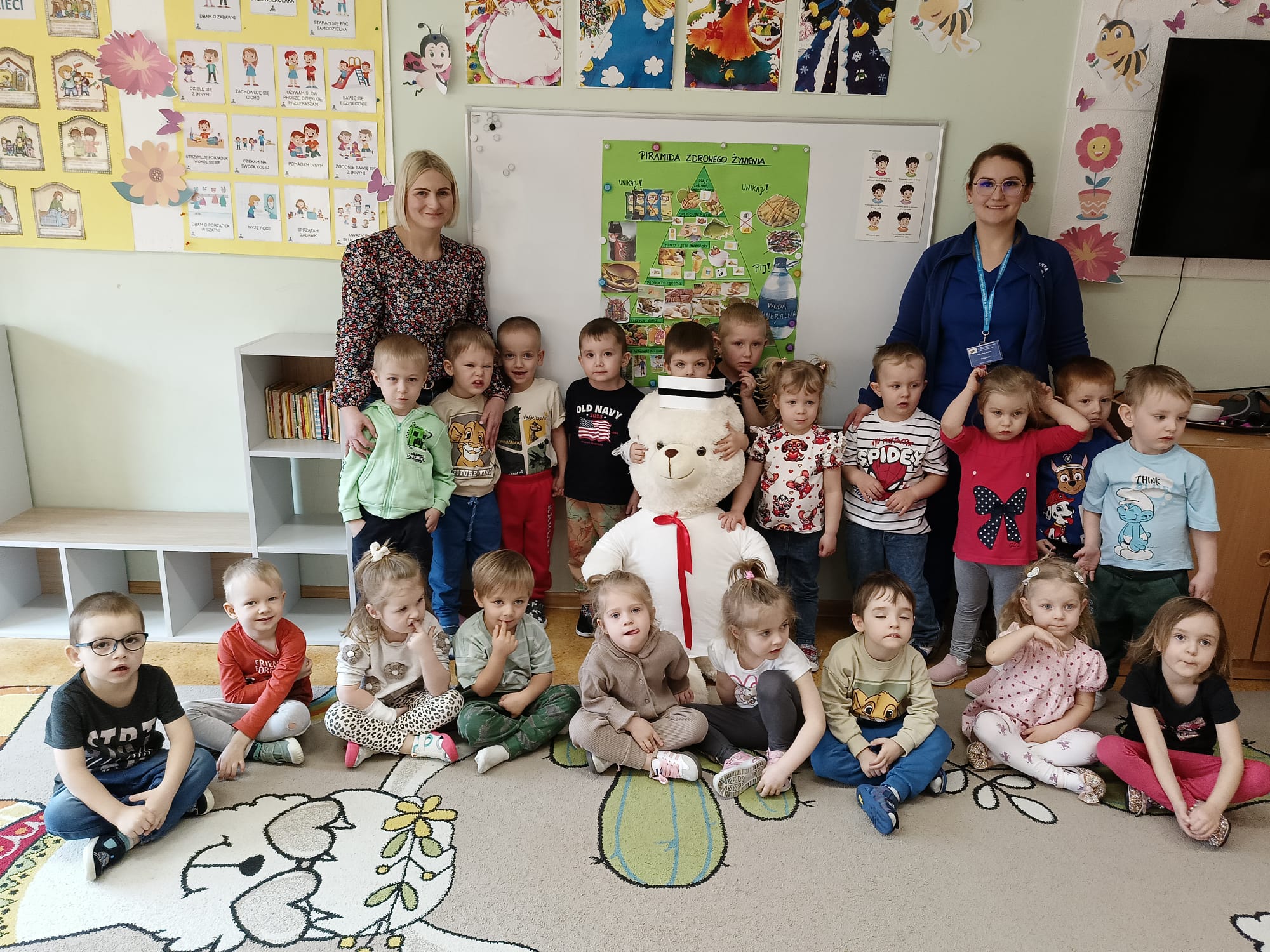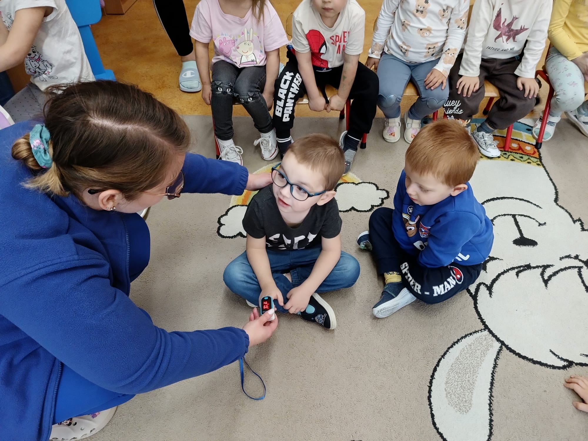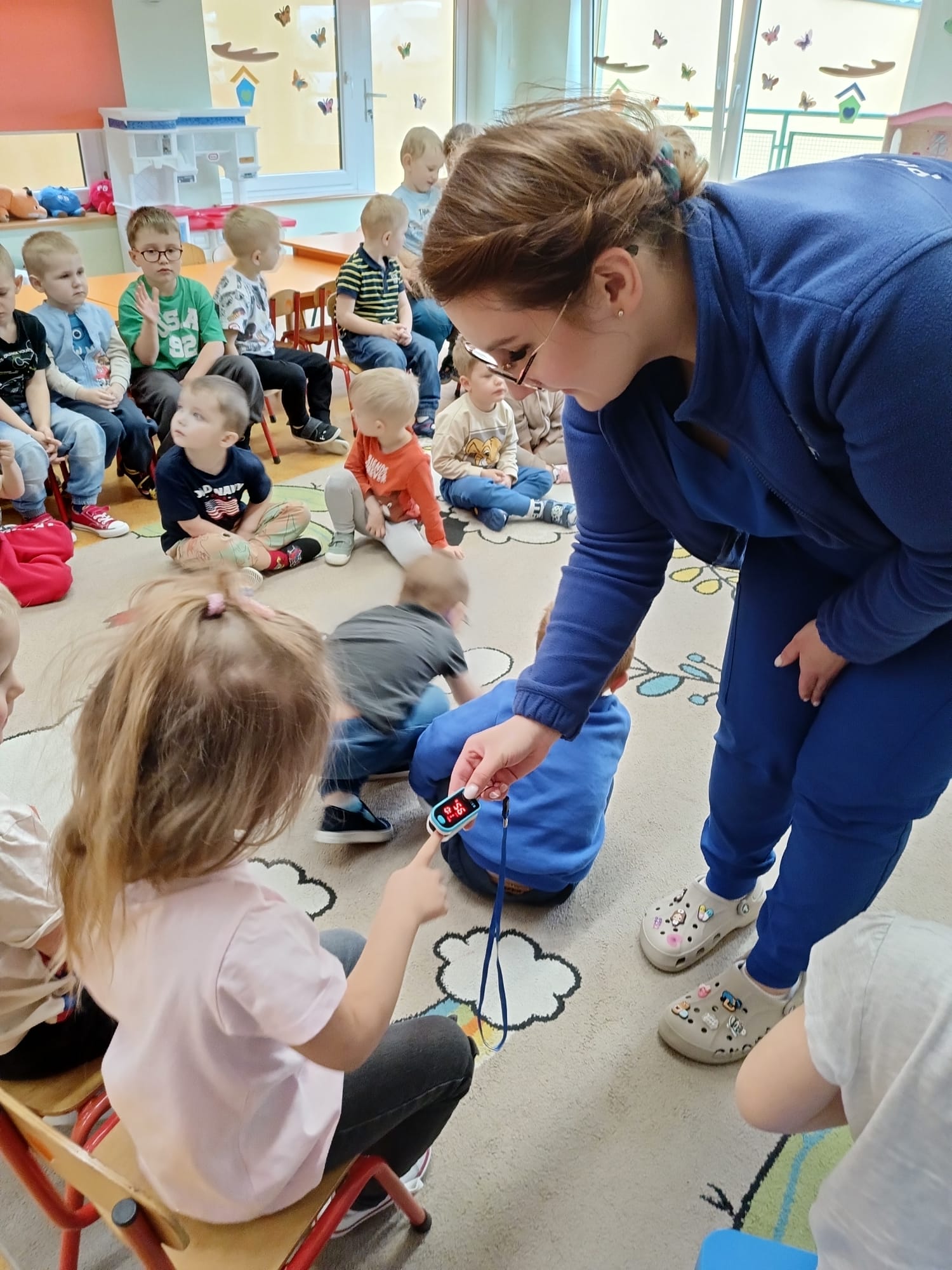 W piątek 27 marca przybył do grupy Krasnali i Motylków, niecodzienny gość – pielęgniarka Pani Karolina Dubiel. Pani Karolina opowiedziała dzieciom na czym polega jej praca, zaprezentowała atrybuty jakimi posługuje się w codziennej pracy, przekazała też informacje jak dbać o zdrowie i higienę. Przedszkolaki uczyły się jak opatrzyć ranę, założyć opaskę uciskową, przykleić plaster, zmierzyć ciśnienie, zrobić zastrzyk, przy pomocy stetoskopu wysłuchiwały bicia serca. Tak praktyczną i zarazem atrakcyjną lekcję z pewnością dzieci zapamiętają na długo. Serdecznie dziękujemy pani Karolinie za poświęcony nam czas. Wizyta pani pielęgniarki zakończyła się pamiątkowym zdjęciem, a Pani Katarzyna Święcicka